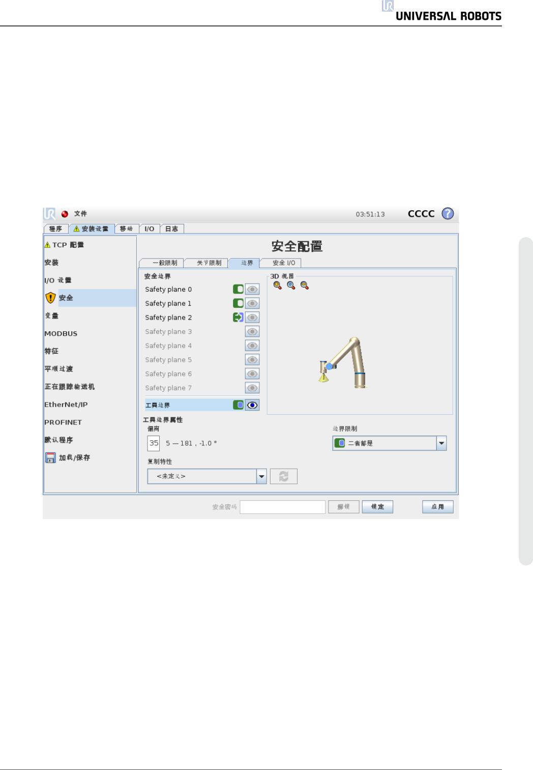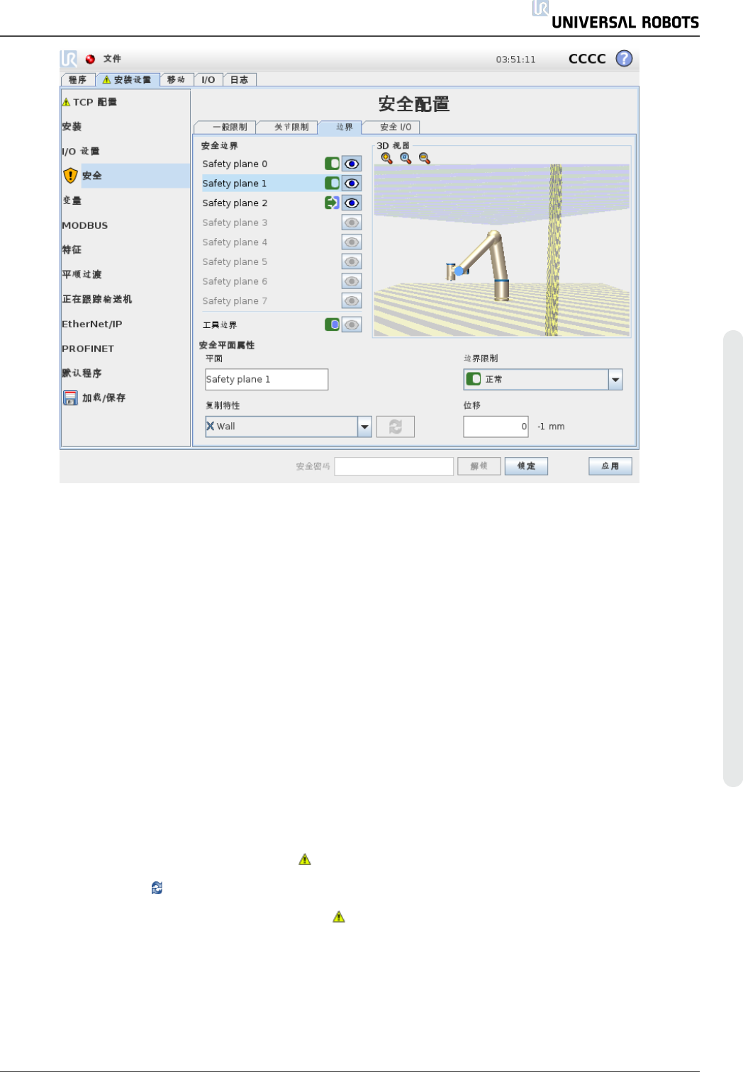 Di sab led 安 全 平 面 从 不 激 活 。 No rma l 当 安 全 系 统 处 于 正 常 模 式 时 , No rma l 模 式 平 面 处 于 激 活 状 态 , 并 严 格 限 制 机 器 人 TC P 的 位 置 。 Re duc ed 当 安 全 系 统 处 于 缩 减 模 式 时 , Re duc ed 模 式 平 面 处 于 激 活 状 态 , 并 严 格 限 制 机 器 人 TC P 的 位 置 。…