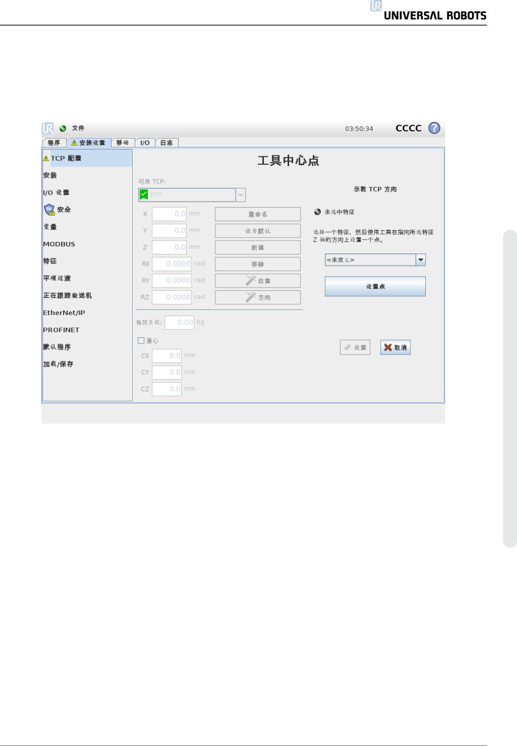 重 心 使 用 字 段 C X 、 CY 和 C Z 指 定 工 具 的 重 心 。 这 些 设 置 适 用 于 所 有 定 义 的 TC P 。 如 果 已 对 版 本 3.8 之 前 创 建 的 安 装 进 行 预 先 设 置 , 则 它 们 支 持 将 重 心 设 置 为 TC P 。 如 果 手 动 在 3.8 或 更 高 版 本 中 设 置 重 心 , 将 永 久 移 除 为 TC P 设 置 重 心 的 功 能 。 可 以 …