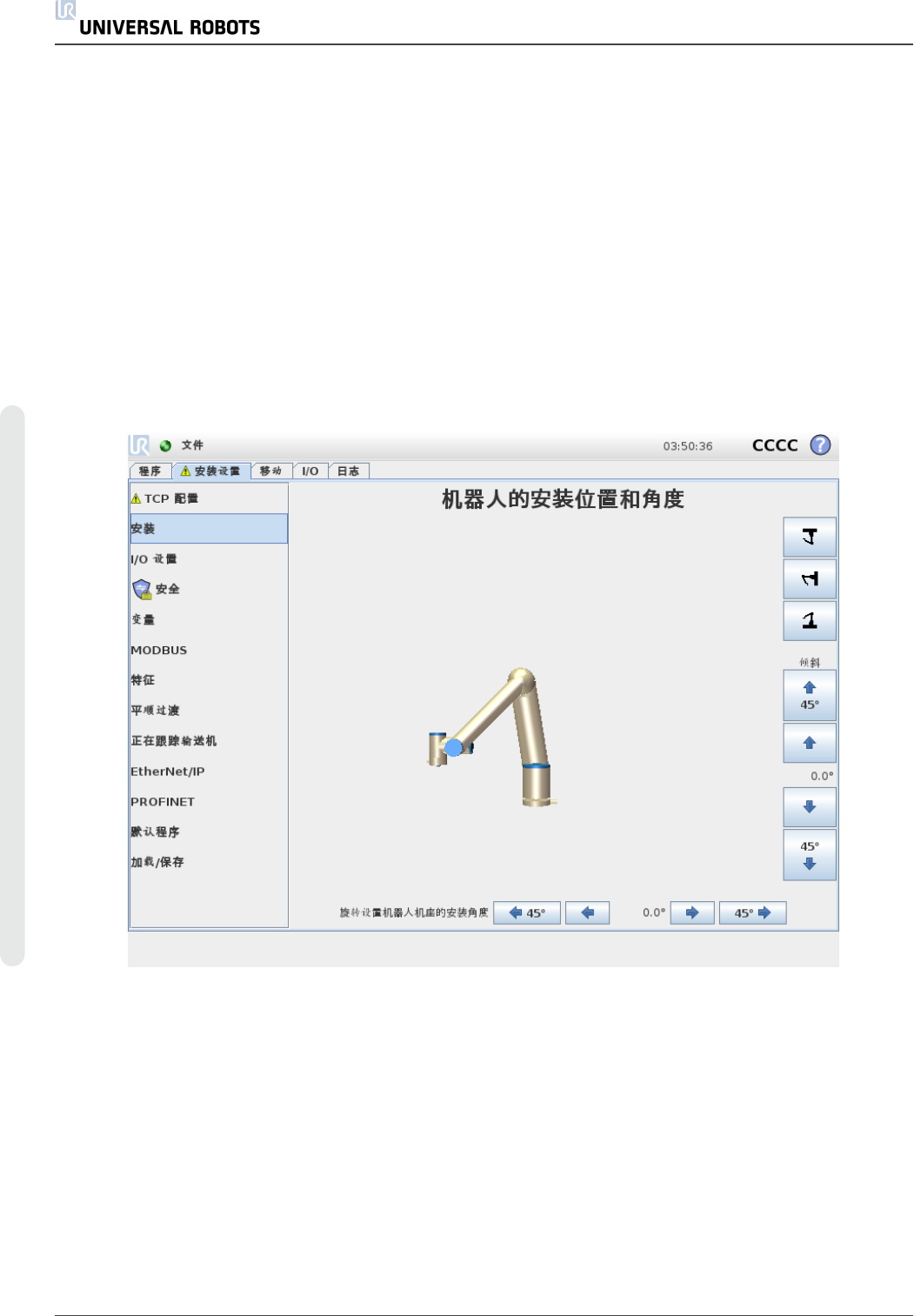 屏幕右侧的按钮可用于设置机器人手臂的安装角度。右上角的三个按钮可将角度设置为吊顶