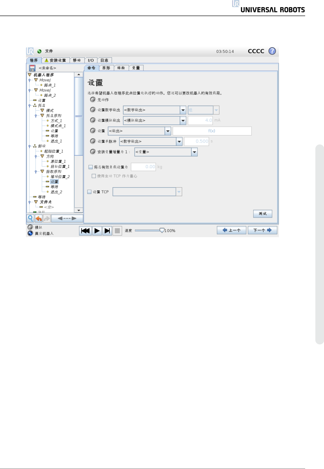 1.2 5.11. 命 令 : 设 置 将 数 字 输 出 或 模 拟 输 出 设 置 为 给 定 值 。 数 字 输 出 也 可 以 设 置 为 发 送 单 个 脉 冲 。 使 用 设 置 命 令 设 置 机 器 人 手 臂 的 有 效 载 荷 。 如 果 工 具 处 承 受 的 重 量 与 预 期 有 效 载 荷 不 同 , 您 可 以 调 整 有 效 载 荷 重 量 , 以 避 免 触 发 机 器 人 保 护 性 停 止 。 如 …