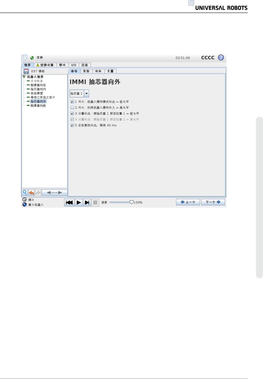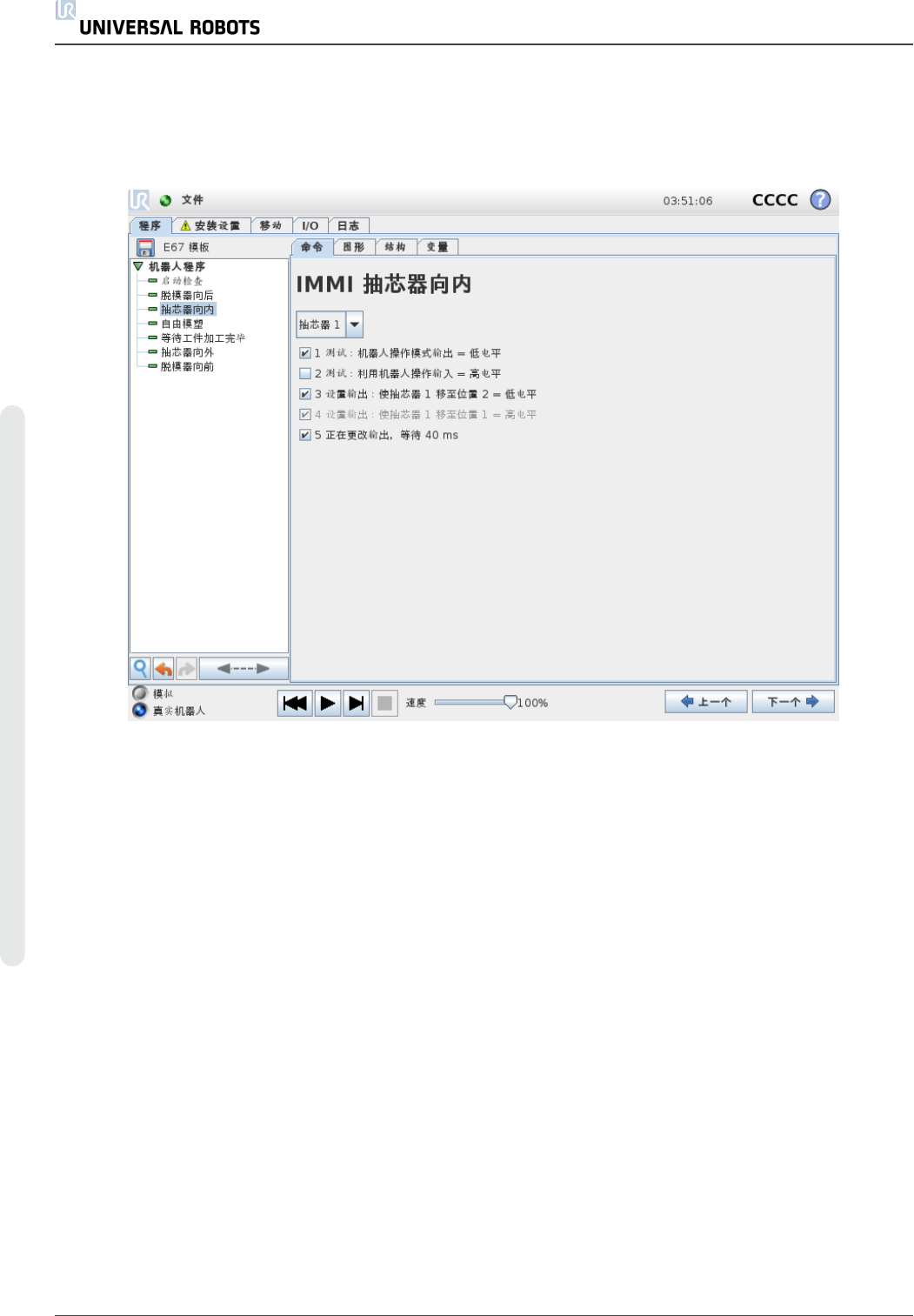 抽 芯 器 向 外 使 抽 芯 器 向 位 置 2 移 动 。 所 用 抽 芯 器 可 从 下 拉 菜 单 中 进 行 选 择 。 使 用 复 选 框 可 启 用 / 禁 用 各 个 步 骤 。 1.2 9.4. I/ O 操 作 和 等 待 由 于 机 器 人 数 字 输 出 可 通 过 动 作 节 点 进 行 设 置 , 因 此 , Euroma p 67 输 出 信 号 也 可 通 过 此 节 点 进 行 设 置 。 安 装 E …