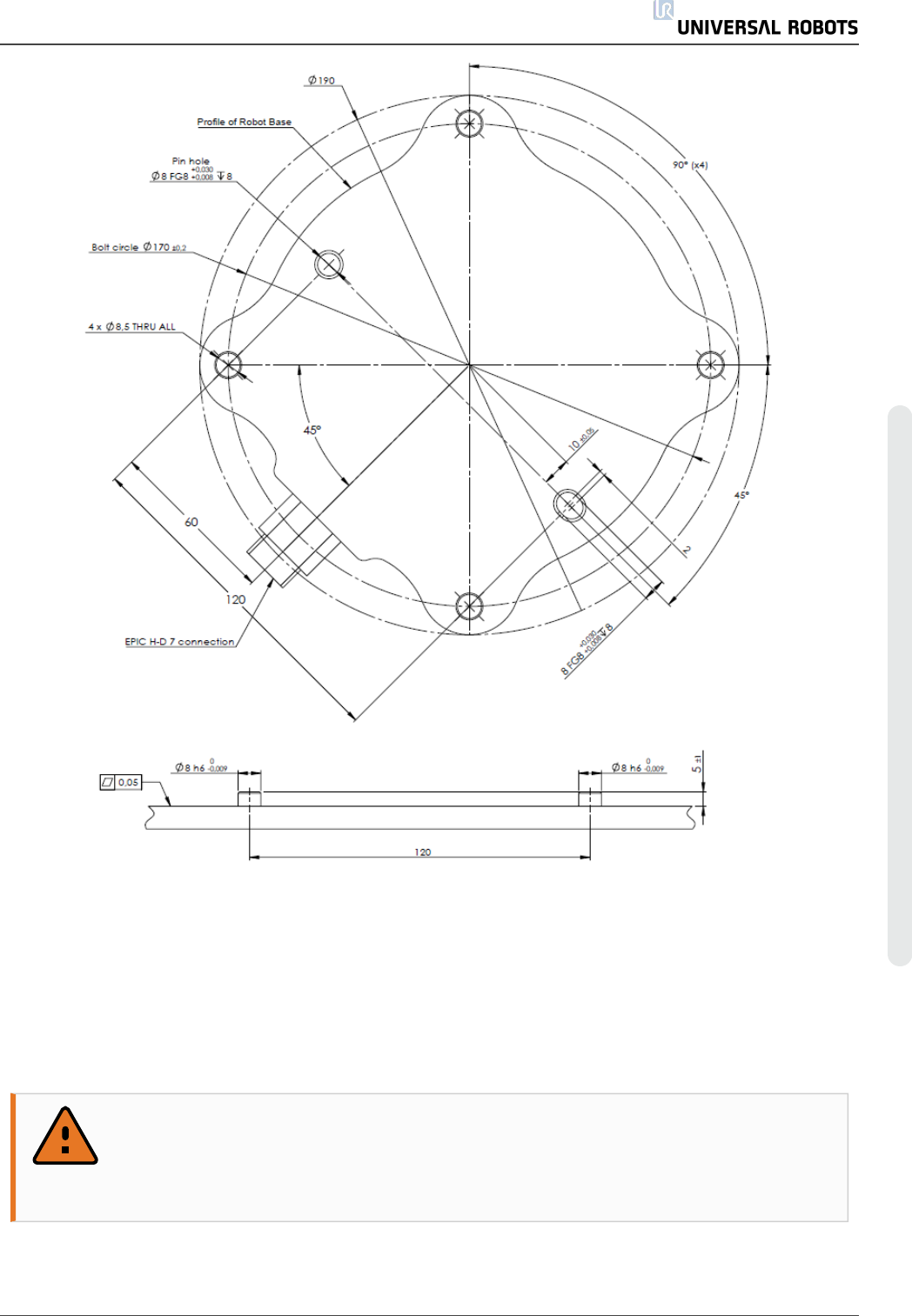 使用四颗 M8 螺栓,通过机器人机座上的四个 8.5mm 孔来安装机器人手臂。建议以 10Nm 扭