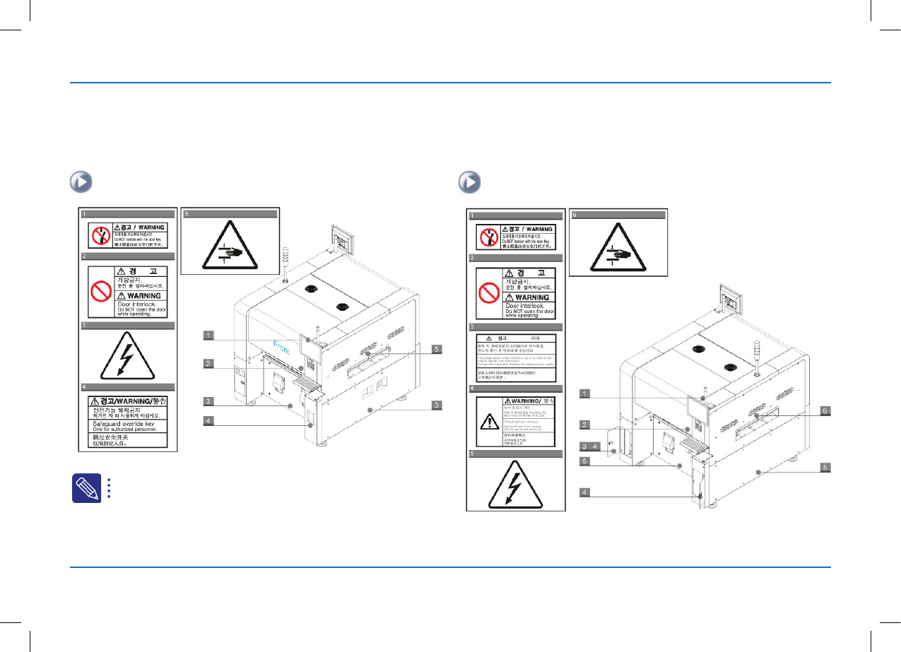 장비의 안전한 사용을 위하여 안전 주의 라벨이 다음의 위치에 부착되어 있습니다.