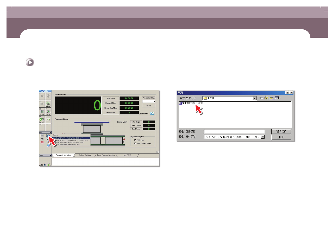 DE CAN S2 Op era tion H and bo ok 3-11 제 3 장 본 Chapter에서는 생산을 수행하는 작업 절차에 대해 알아봅니다. 생산하기 Advanced Chip Shooter 작업 준비하 기 Ⅱ > PCB 파일 다운로 드 작업 준비하기 Ⅱ Step 3. 'Op en' 클릭 ㆍ 열기 대화상자를 엽니다. Step 4. PCB 파일 선 택 ㆍ 작업할 …