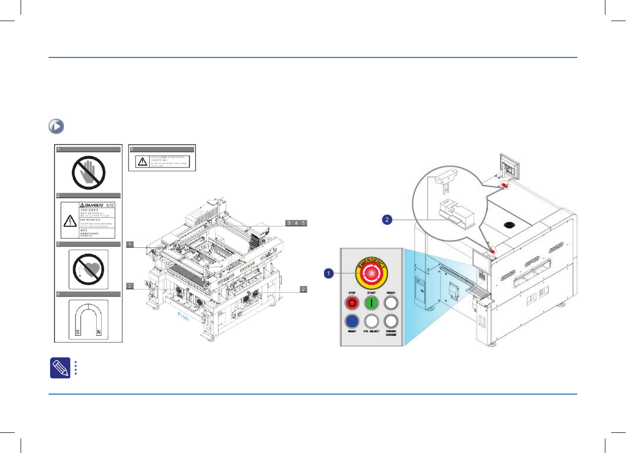 ※ 안전을 위한 경고 및 주의 사항 장비의 안전한 사용을 위하여 안전 주의 라벨이 다음의 위치에 부착되어 있습니다. 장비 내부 안전 주의 라벨에 대한 설명은 Administr ator' s Guide를 참조하세요. ※ 안전 장치의 동작 긴급한 상황에서 즉시 장비의 작동을 정지합니다. 1. EM ERG ENCY 스 위치 2. D oor Lock 스위 치