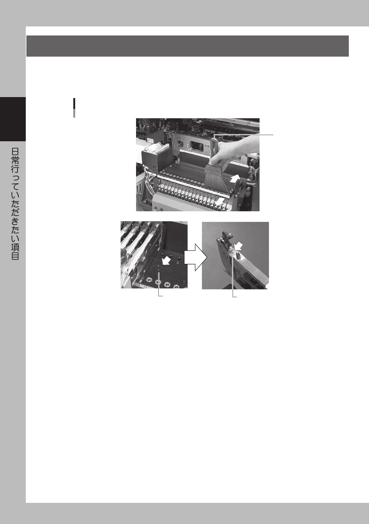 2-6 2 4 . フ ィ ー ダ ー プ レ ー ト の 清 掃 フ ィ ー ダ ー プ レ ー ト を 付 属 の ブ ラ シ で 清 掃 し て く だ さ い 。 フ ィ ー ダ ー プ レ ー ト 上 に チ ッ プ や 異 物 が 落 ち て い る と 、 フ ィ ー ダ ー セ ッ ト を 行 う 際 に 噛 み 込 ん で し ま っ て 吸 着 位 置 の ズ レ を 発 生 さ せ る 原 因 と な り …