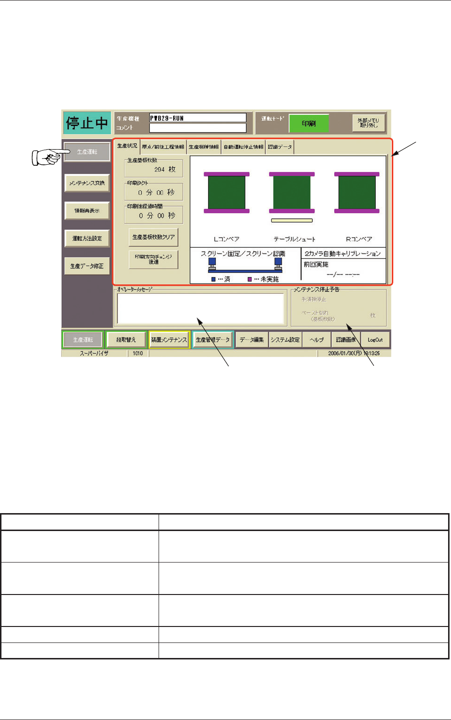 4 - 4 Tg 1298 -ID-OP 0602 - 001 2. “生産運転”サブメニュー 2. “生産運転”サブメニュー • 画面の表示 “生産運転”サブメニューバーの[生産運転]ボタンを押すと、以下 の画面が表示されます。 [1] [2] [3] Fig.2D3 “生産運転”サブメニュー画面 • 画面の構成 [1] タブ “生産運転”サブメニュー画面は 5 つのタブシートに分かれてお り、タブを押すと各タブシートが表示されます。…