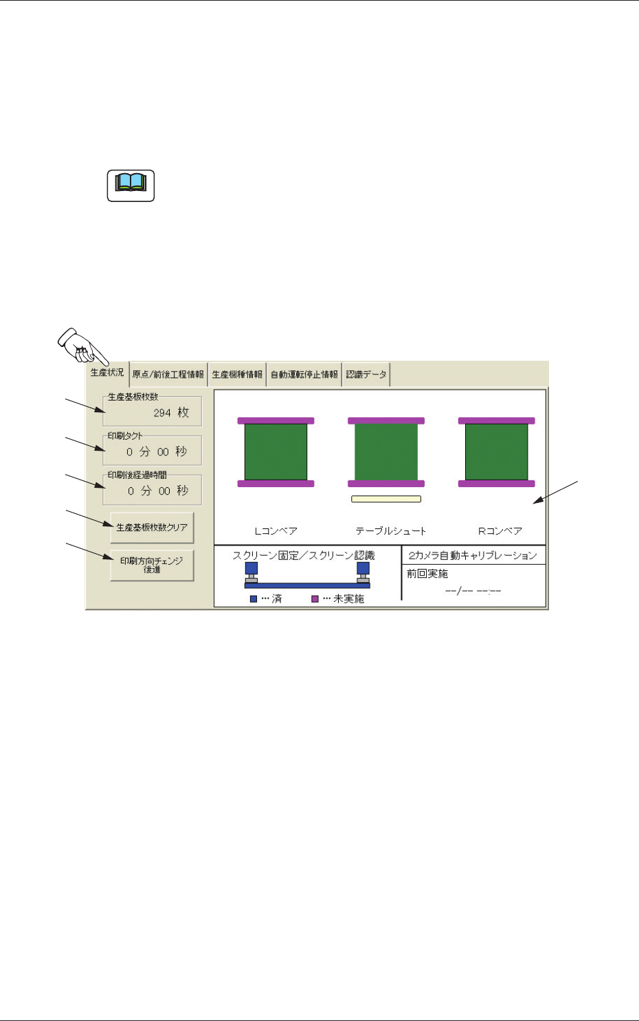 4 - 6 Tg 1298 -ID-OP 0602 - 001 2.1 “生産状況”タブ 生産した基板の枚数、印刷に要する時間、印刷が終了してからの経 過時間などが表示されます。 タブシートの L/R コンベア部に基板がある場合はコンベアの間の色 が黒から緑に変わり、基板の有無を自動的に表示します。 ノート テーブルシュート部には基板を検出するセンサがないので基板を手 で取り除いてから運転を再開する場合などで画面の表示と実際が異 なる場…