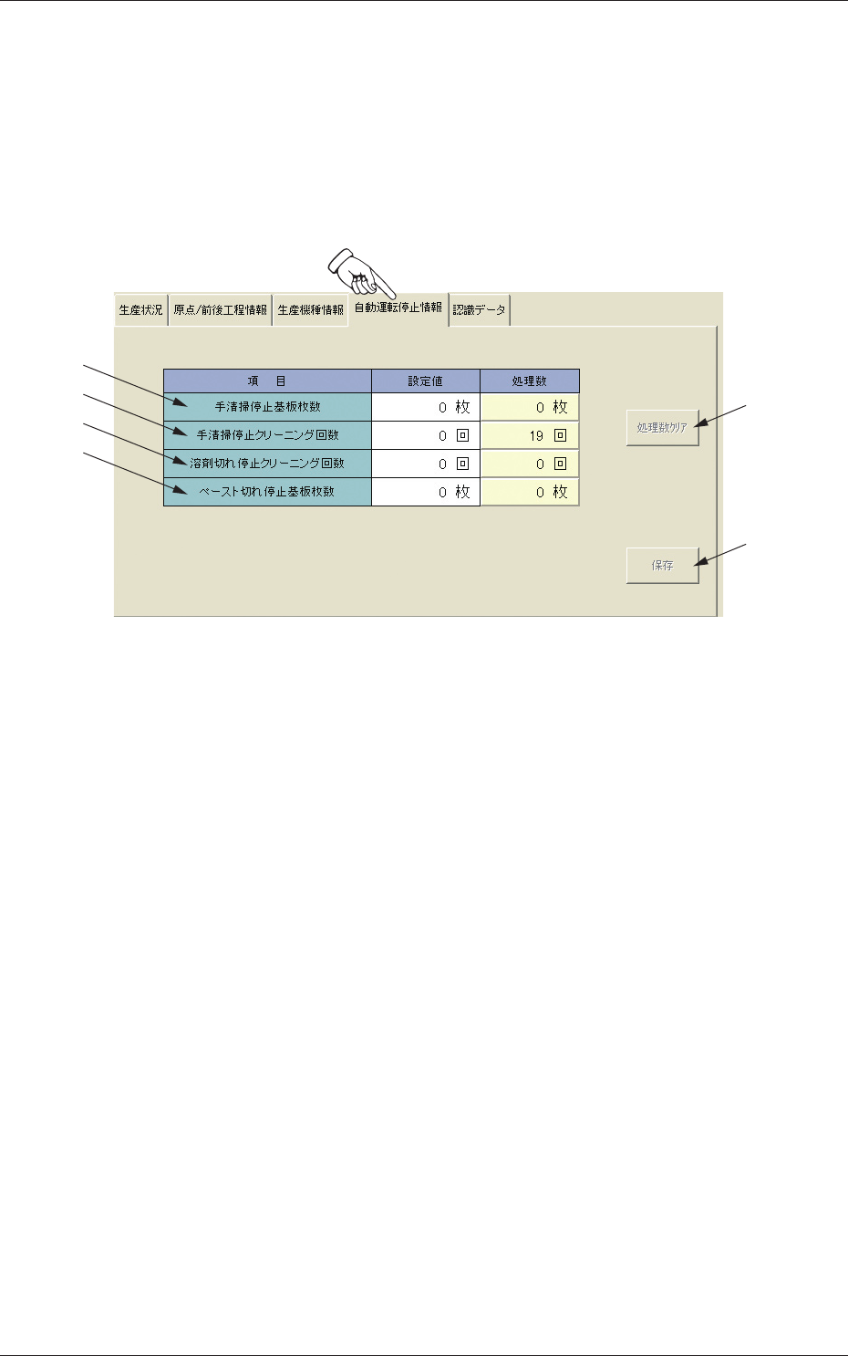 手で清掃する場合の、停止するまでの基板生産枚数が、設定値