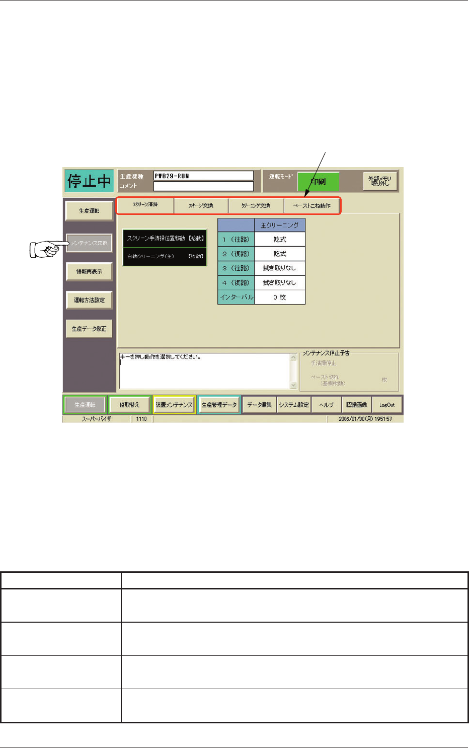 “生産運転”サブメニューバーの[メンテナンス交換]ボタンを押すと、