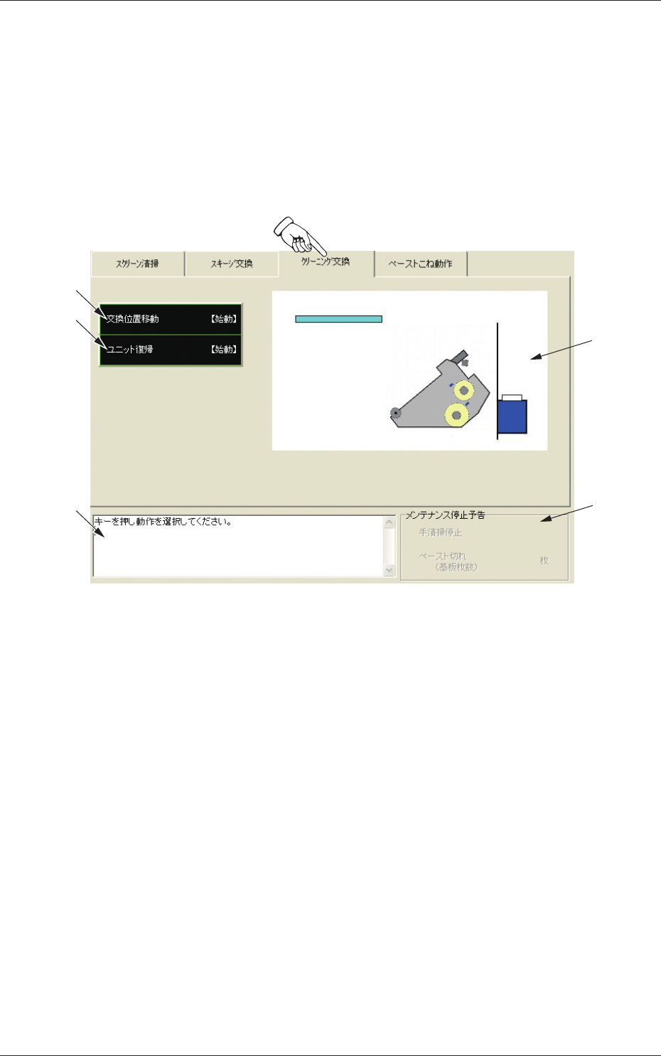 4 - 20 Tg 1298 -ID-OP 3.3 “クリーニング交換”タブ クリーニングペーパーやクリーニングペーパーホルダの交換時の各 ユニットの移動を行うことができます。 • シートの表示 “メンテナンス交換”サブメニュー画面の[クリーニング交換] タブを押すと、以下のタブシートが表示されます。 [1] [3] [4] [5] [2] Fig.2D16 “クリーニング交換”タブシート • シートの構成 [1] [交換位置移動(始動…