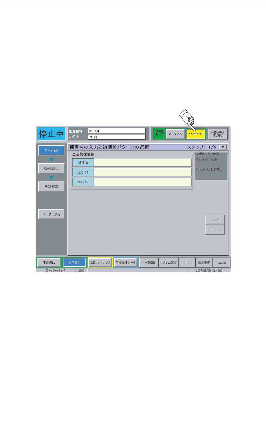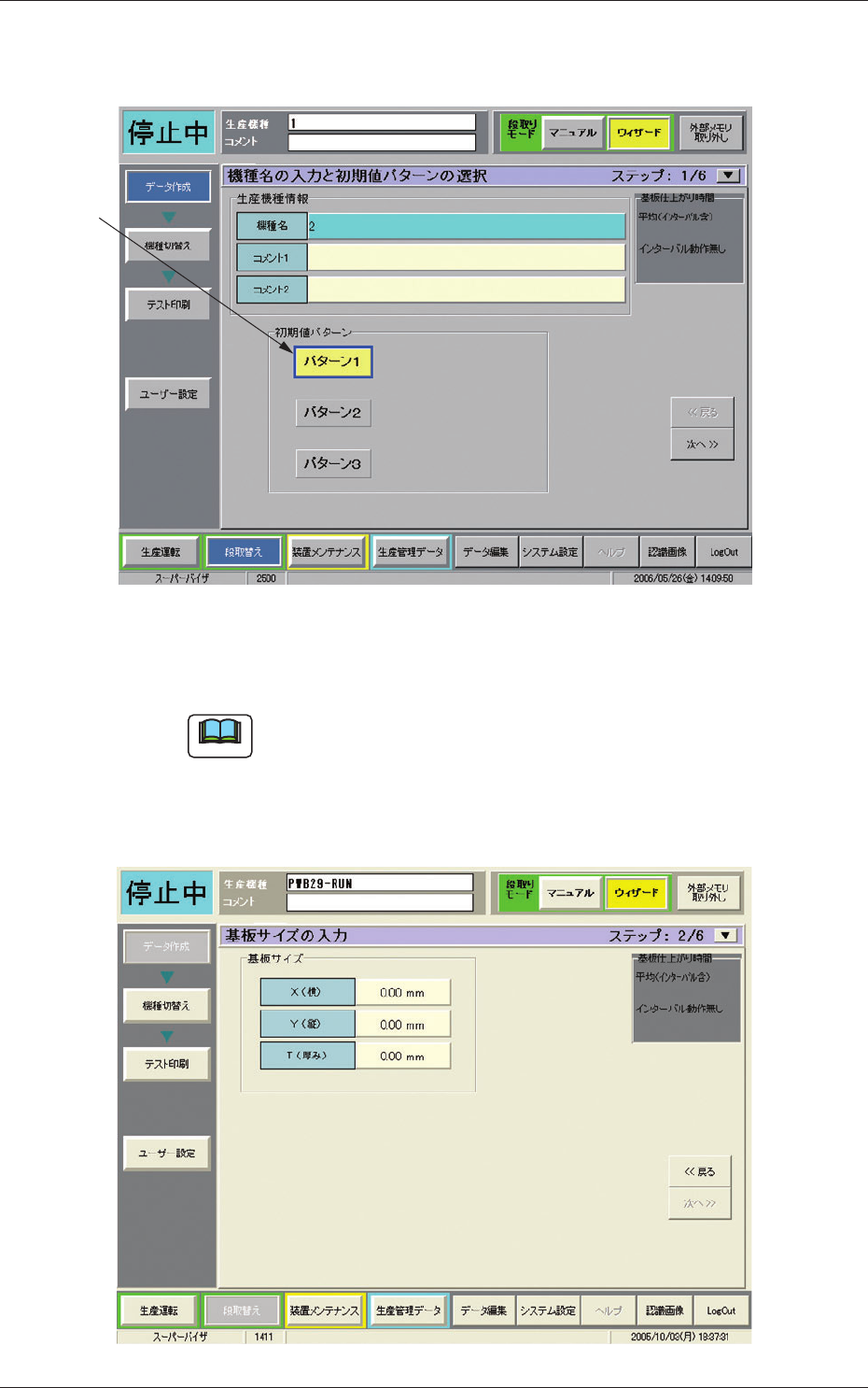 5 - 28 Tg 1298 -ID-OP 3.2 “データ作成”サブメニュー 3.2 “データ作成”サブメニュー 対話形式で手順を追って各データを入力することでパターンプログ ラムの作成が行えます。 6 個のステップで構成されます。 • 画面の表示 “段取替え”サブメニューバーの [ データ作成 ] ボタンを押し、 “段 取りモード”の [ ウィザード ] ボタンを押すと、以下の画面が表示 されます。 Fig. 2E24 0703 -…