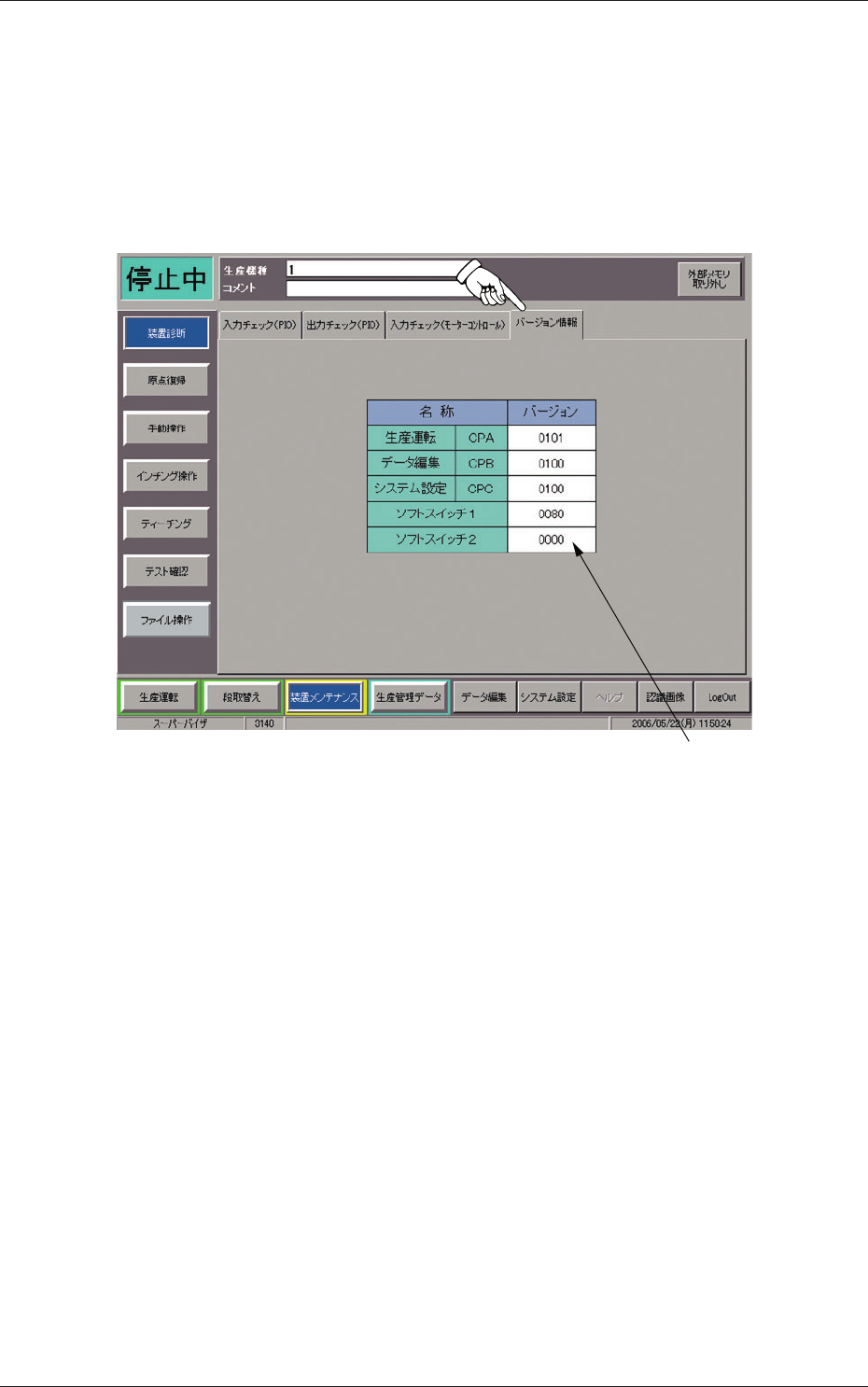“装置診断”サブメニュー画面の[バージョン情報]タブを押すと、