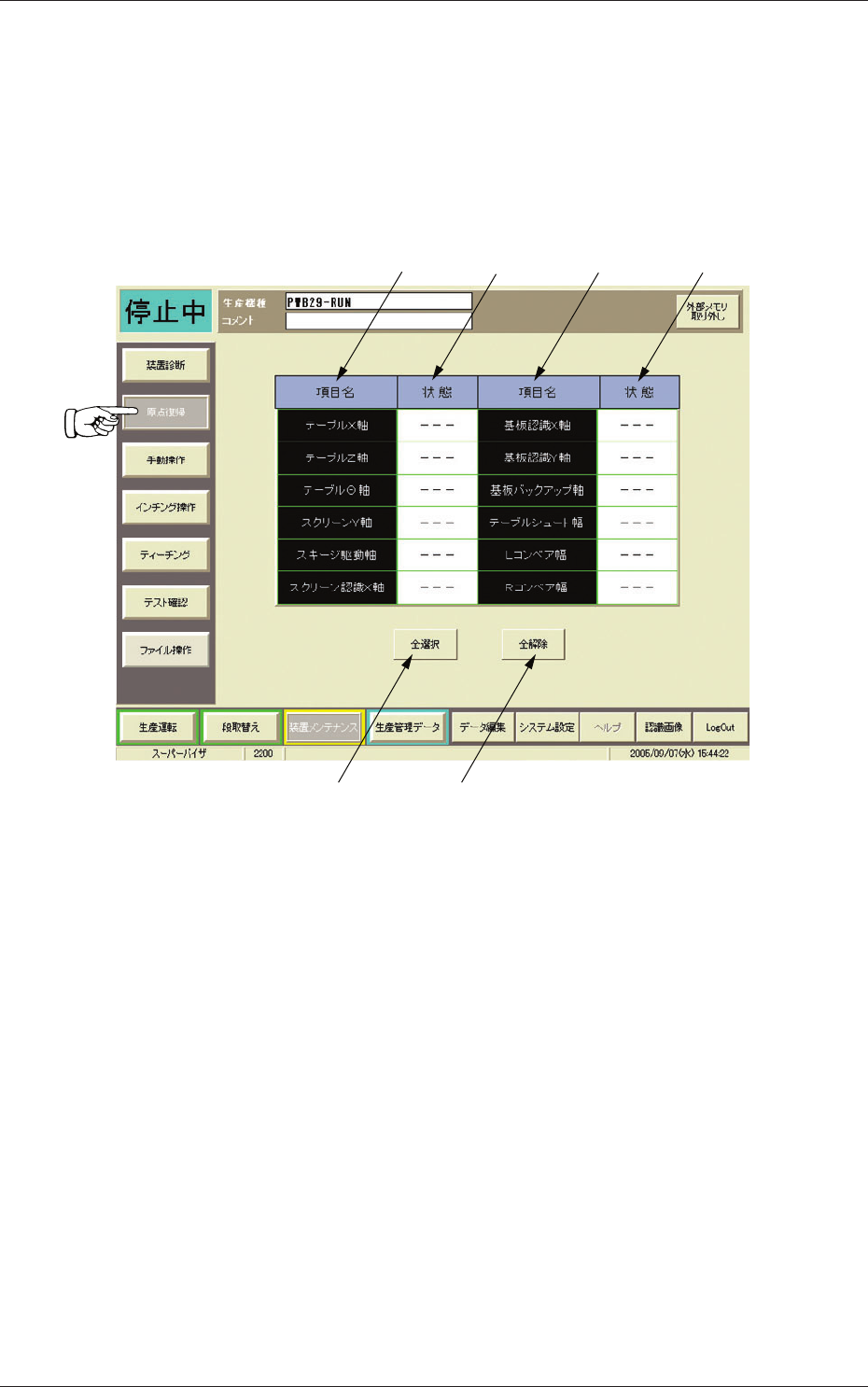 装置メンテナンスサブメニューバーの[原点復帰]ボタンを押すと、