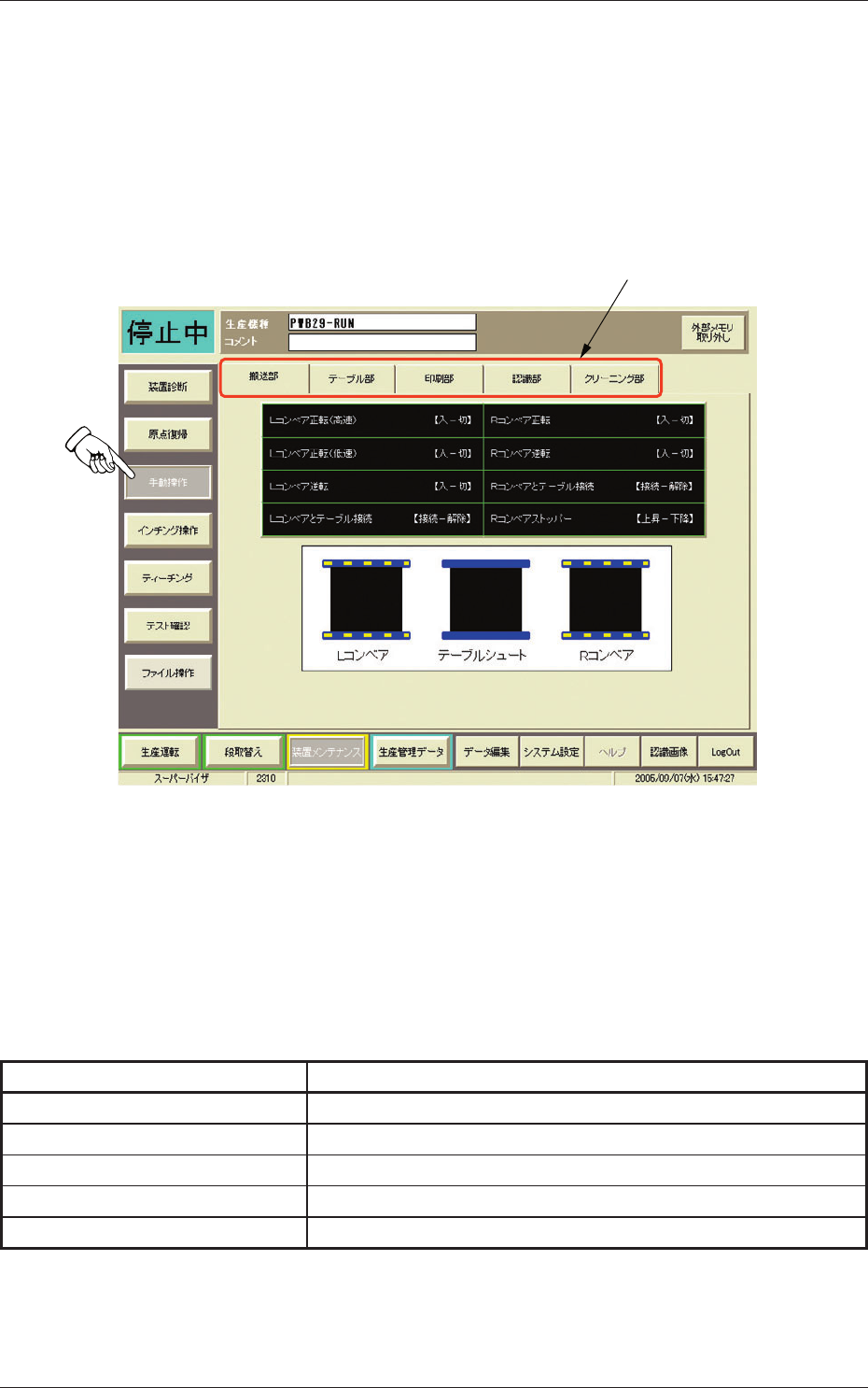 搬送部 L コンベアおよび R コンベアの手動操作を行います。