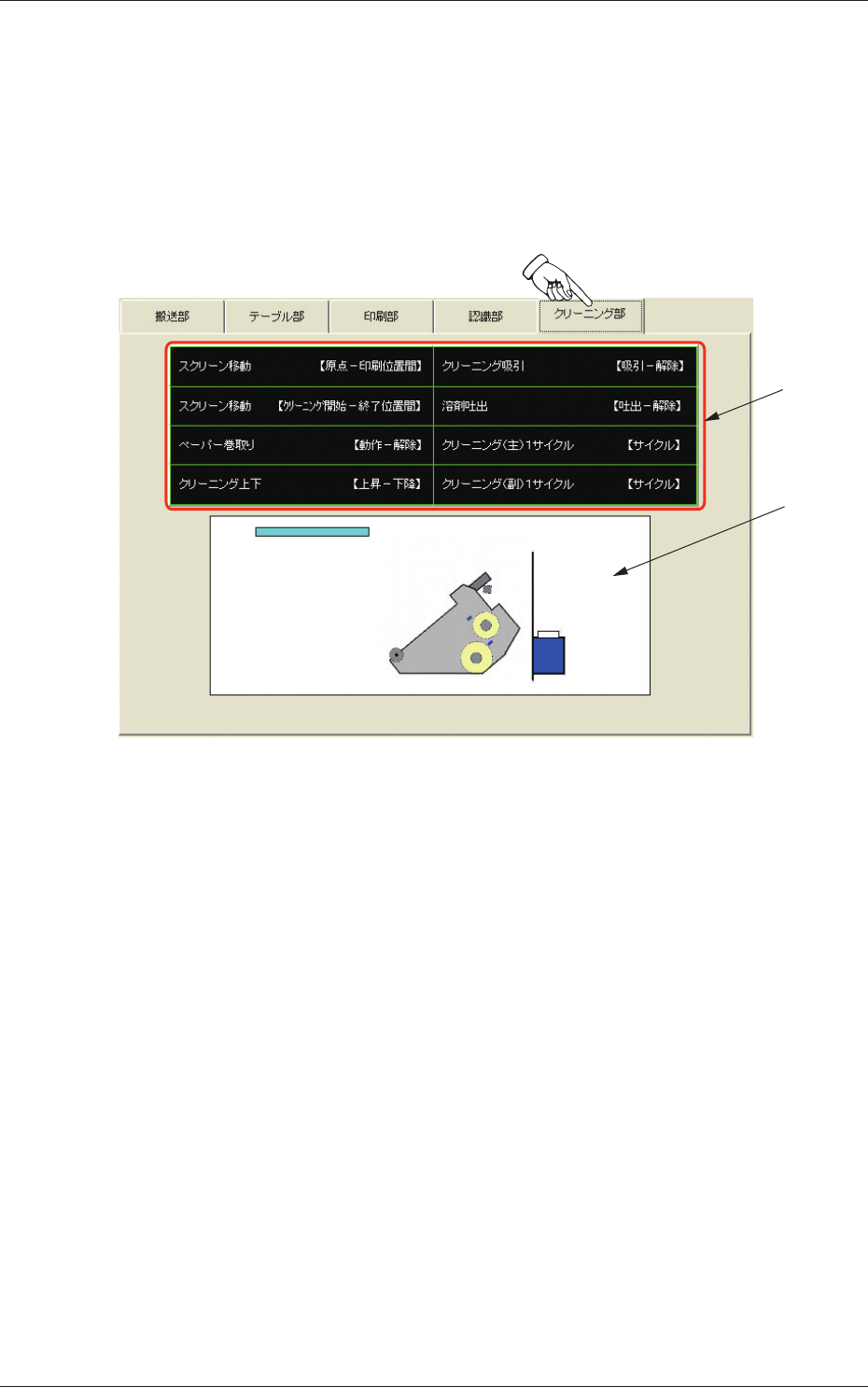 6 - 17 Tg 1298 -ID-OP 4.5 “クリーニング部”タブ クリーニング部の手動操作を行います。 • シートの表示 “手動操作”サブメニュー画面の[クリーニング部]タブを押すと、 以下のタブシートが表示されます。 [1] [2] Fig.2F14 “クリーニング部”タブシート • シートの構成 [1] 動作ユニット選択ボタン ボタンを押すと背景が青色に変わり動作するユニットが選択さ れます。 前面操作パネルの[始動]ボタ…