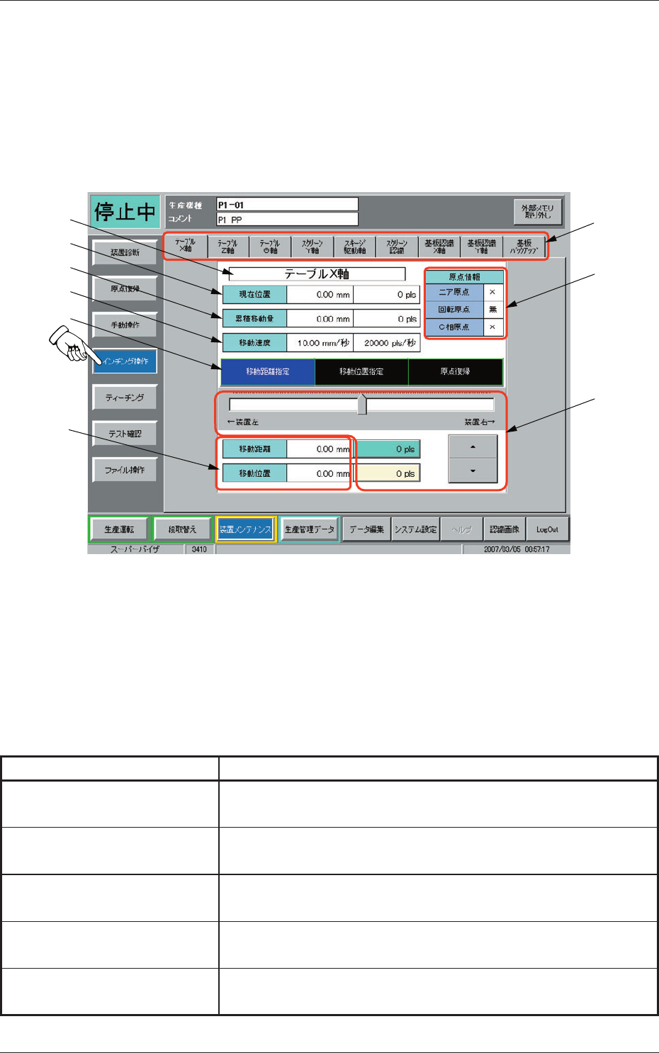 装置メンテナンスサブメニューバーの[インチング操作]ボタンを