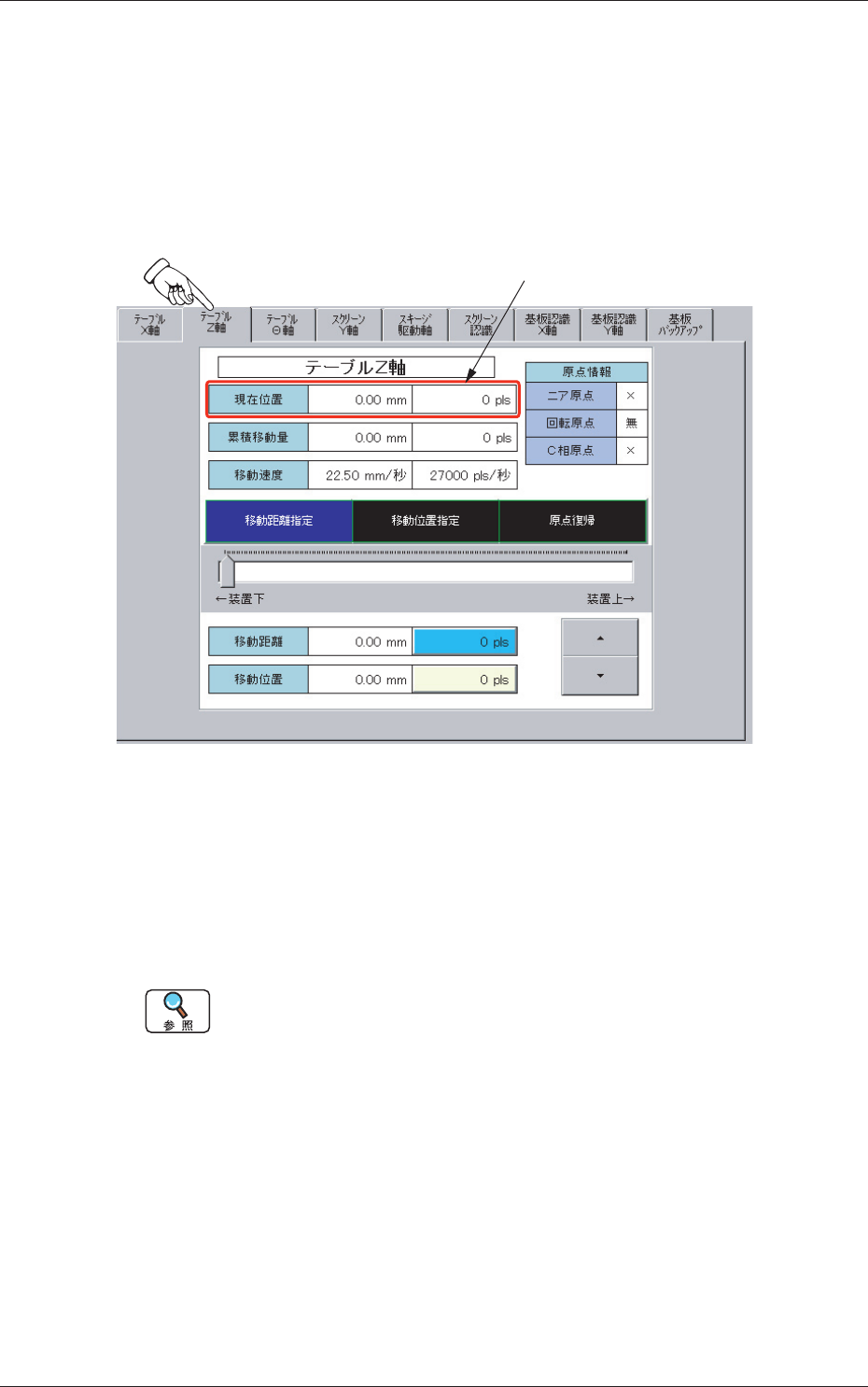 6 - 25 Tg 1298 -ID-OP 5.3 “テーブル Z 軸”タブ 5.3 “テーブル Z 軸”タブ テーブルの Z 軸のインチング操作を行います。 • シートの表示 “インチング操作” サブメニュー画面の [テーブル Z 軸] タブを押すと、 以下のタブシートが表示されます。 [1] Fig.2F19 “テーブル Z 軸”タブシート • シートの構成 [1] 現在位置 ユニットの現在の位置が、移動距離とパルス数で表示されます…