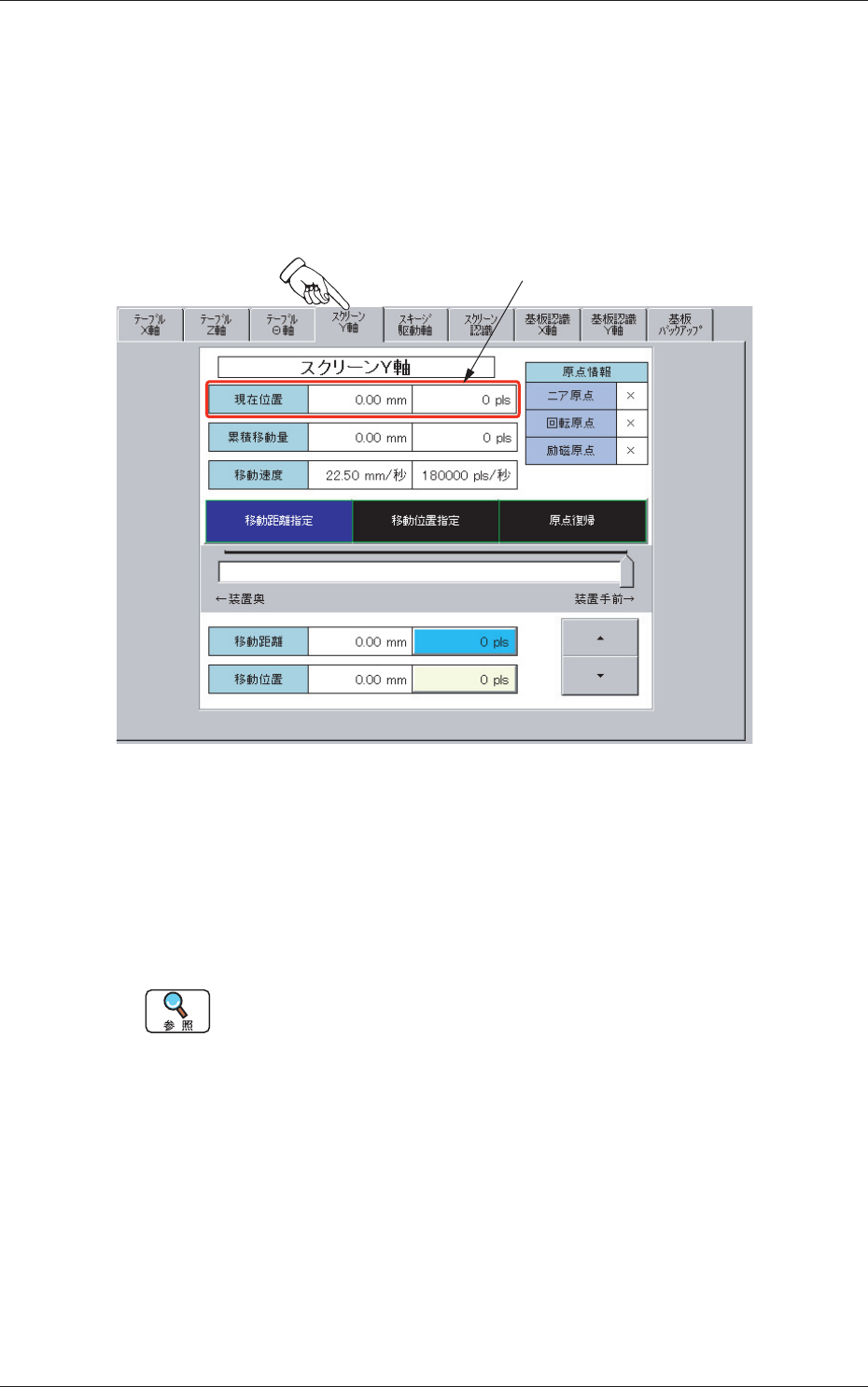 6 - 27 Tg 1298 -ID-OP 5.5 “スクリーン Y 軸”タブ 5.5 “スクリーン Y 軸”タブ スクリーンの Y 軸のインチング操作を行います。 • シートの表示 “インチング操作”サブメニュー画面の[スクリーン Y 軸]タブを押 すと、以下のタブシートが表示されます。 [1] Fig.2F21 “スクリーン Y 軸”タブシート • シートの構成 [1] 現在位置 ユニットの現在の位置が、移動距離とパルス数で表示され…