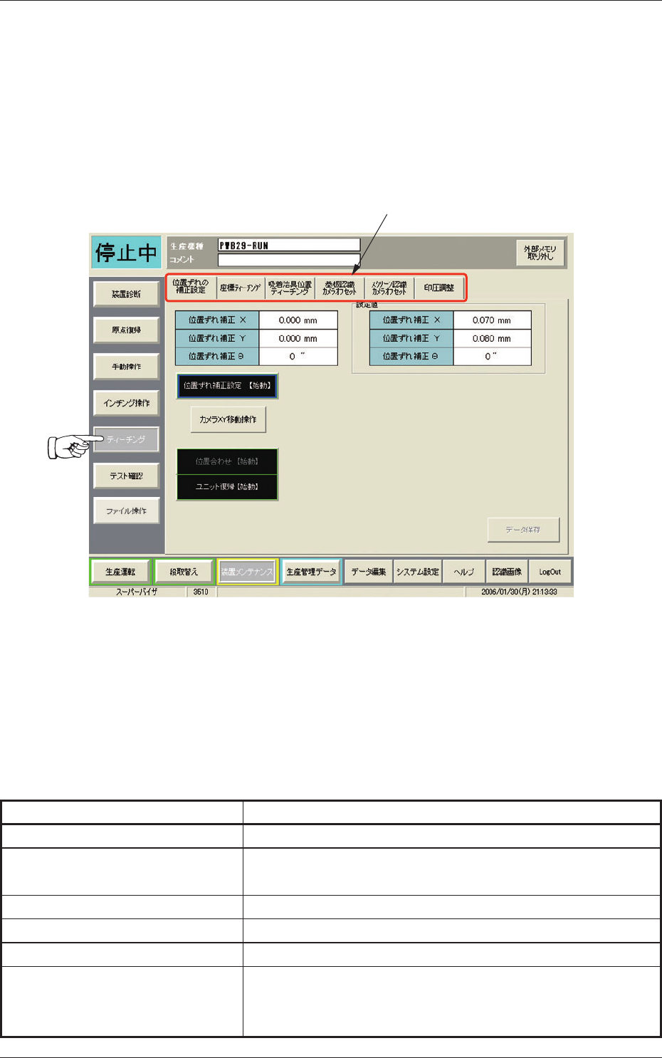 6 - 34 Tg 1298 -ID-OP 6.1 “位置ずれの補正設定”タブ テーブル(基板)をスクリーン下部に移動させ、スクリーン認識カ メラを用いて目合せにより基板とスクリーンの位置ずれの補正を行 います。 また、カメラを用いず目合わせによっても、基板とスクリーンの位 置ずれの補正が可能です。 ノート (a) 位置ずれ補正により設定されたデータは、 [データ保存]ボタ ン操作により“データ編集” 、 “印刷データ”の“印刷ずれ補正…