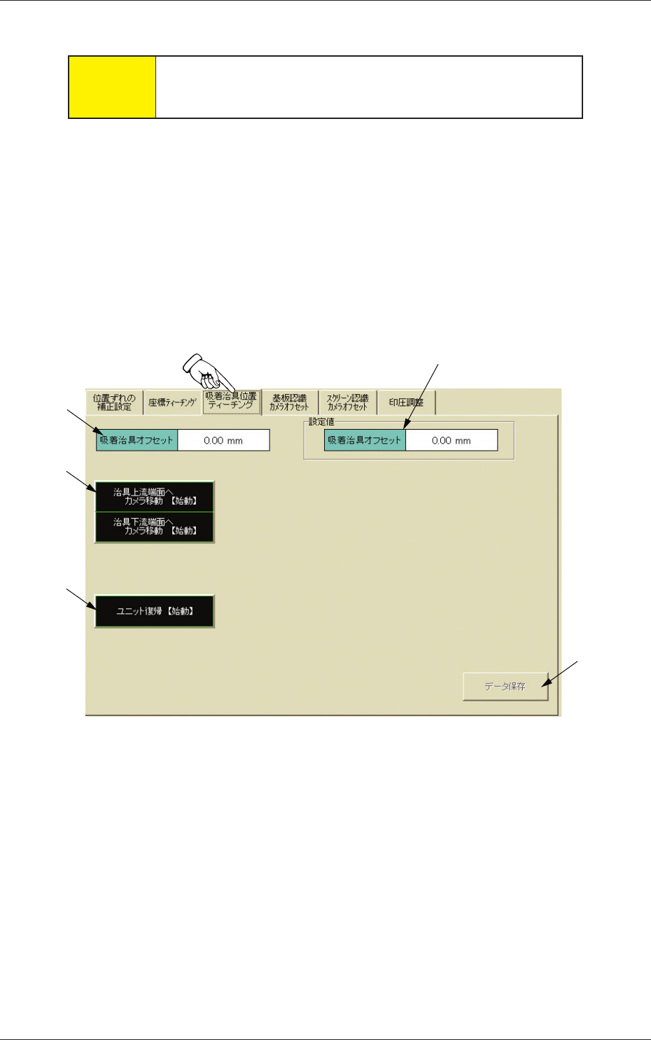 6 - 46 Tg 1298 -ID-OP 6.3 “吸着治具位置ティーチング”タブ 注意 このデータは、工場出荷時に調整、設定されていますので むやみに変更しないでください。 ここでは、 “データ編集” 、 “オフセットデータ”の吸着治具オフセッ トデータを認識カメラと吸着治具を使用して、ティーチングするこ とができます。 ここでティーチングしたデータは、 “システム設定” 、 “オフセットデー タ”の“吸着治具”のデータに反映されま…