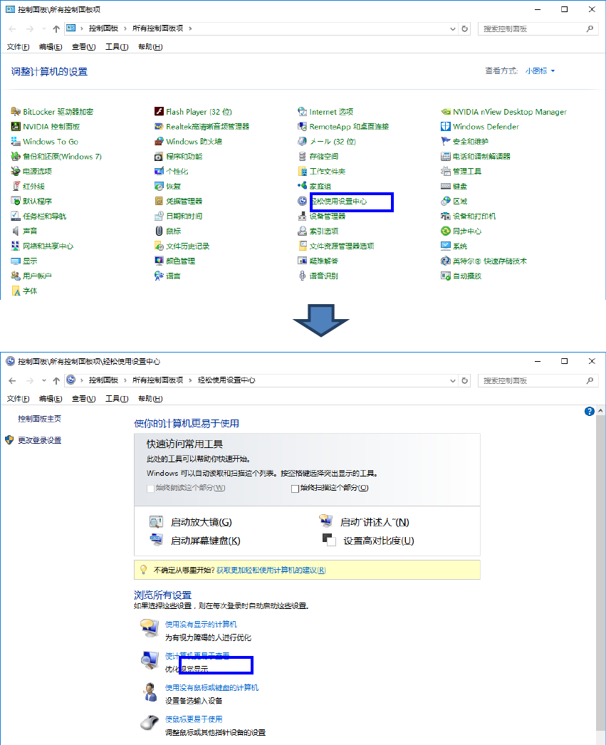 ① 在控制面板上选择“轻松使用设置中心”-“使计算机更易于查看”。