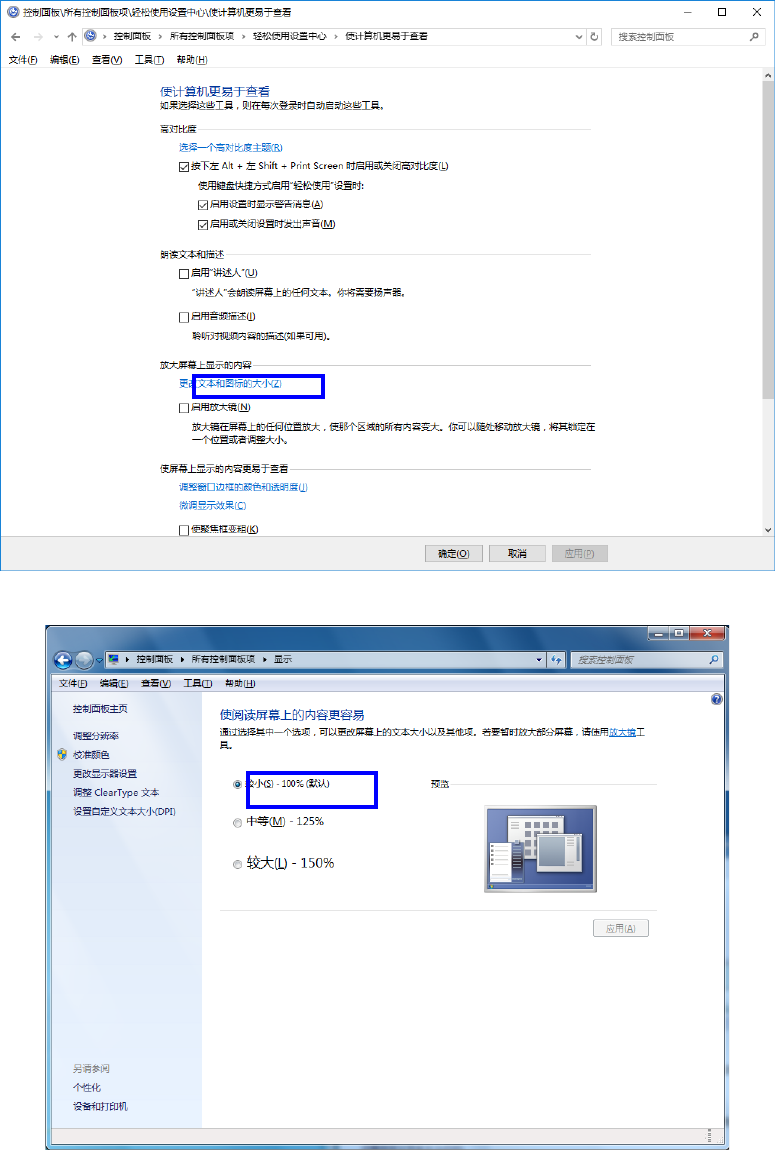 ② 如果是 Windows7,请选择“较小(S)-100%(默认)”,点击应用。