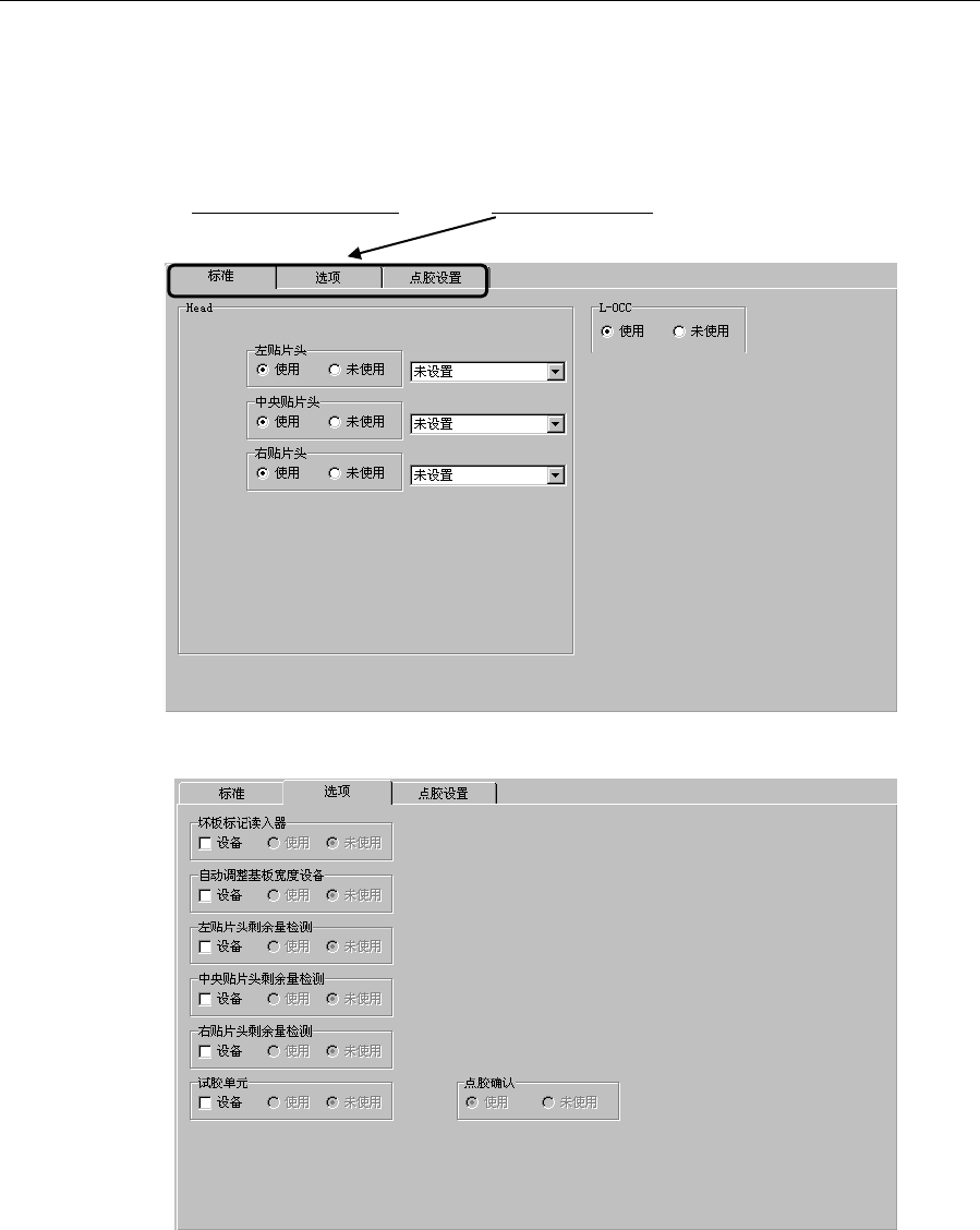 第 3 章 EPU 设置 3- 17 图 3- 7 - 12 点胶设置 · 标准项目 在相应站台上显示标准设备(单元)安装状况。 · 选项 在相应站台上显示可根据选项安装的设备(单元)。 ・ 点胶设置 在相应站台上显示所设置的各点胶头的针种类、胶粘剂种类、点胶条件。
