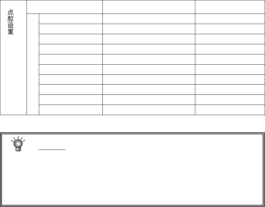 第 3 章 EPU 设置 3- 19 胶粘 剂 种类的设置 按下浏览, 在列表框中选择所需 的文件 。 点 胶 条 件 设 置 点胶时间 在编辑框输入。 点胶压力 在编辑框输入。 X-Y- θ结束等待时间 在编辑框输入。 点胶延迟时间 在编辑框输入。 Z 轴下降速度 选择复选 框。 Z 轴上升速度 选择复选框 。 下死点保持时间 在编辑框输入。 X-Y- θ 移动等待时间 在编辑框输入。 切胶动作次数 在编辑框输入。 切胶动作类型 选择…