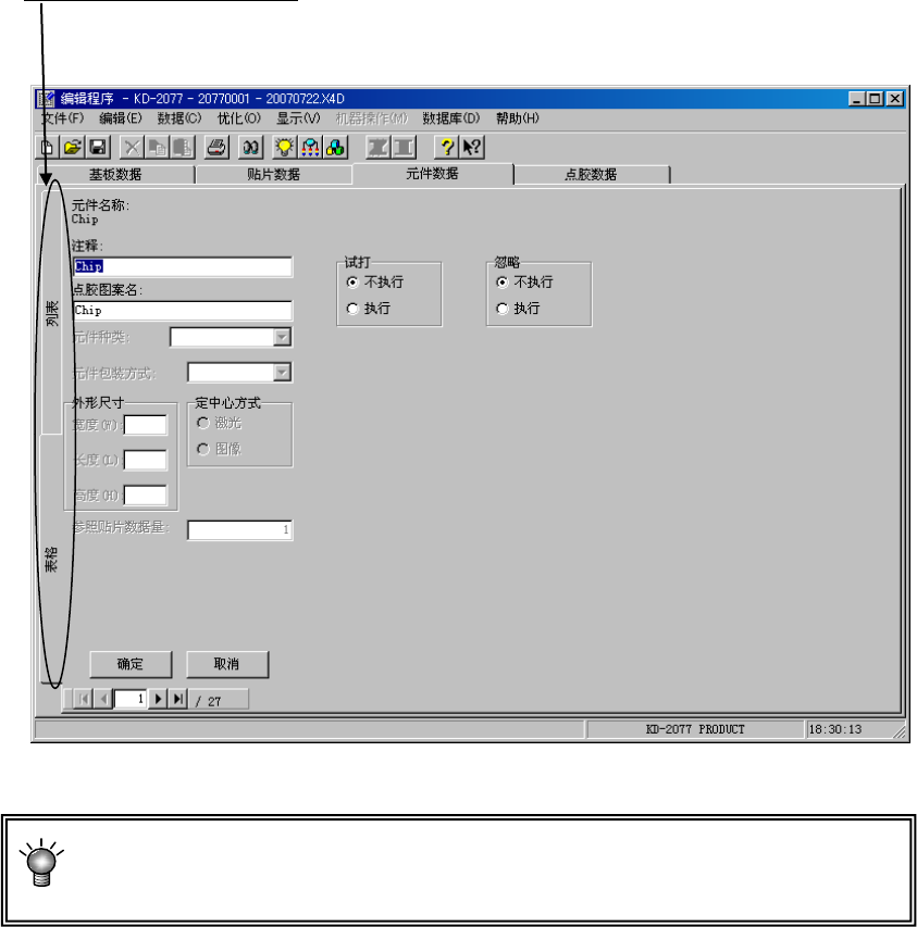 从贴片机读入生产程序时,或从数据库读入元件数据时,显示元件数据的详细内容。不能