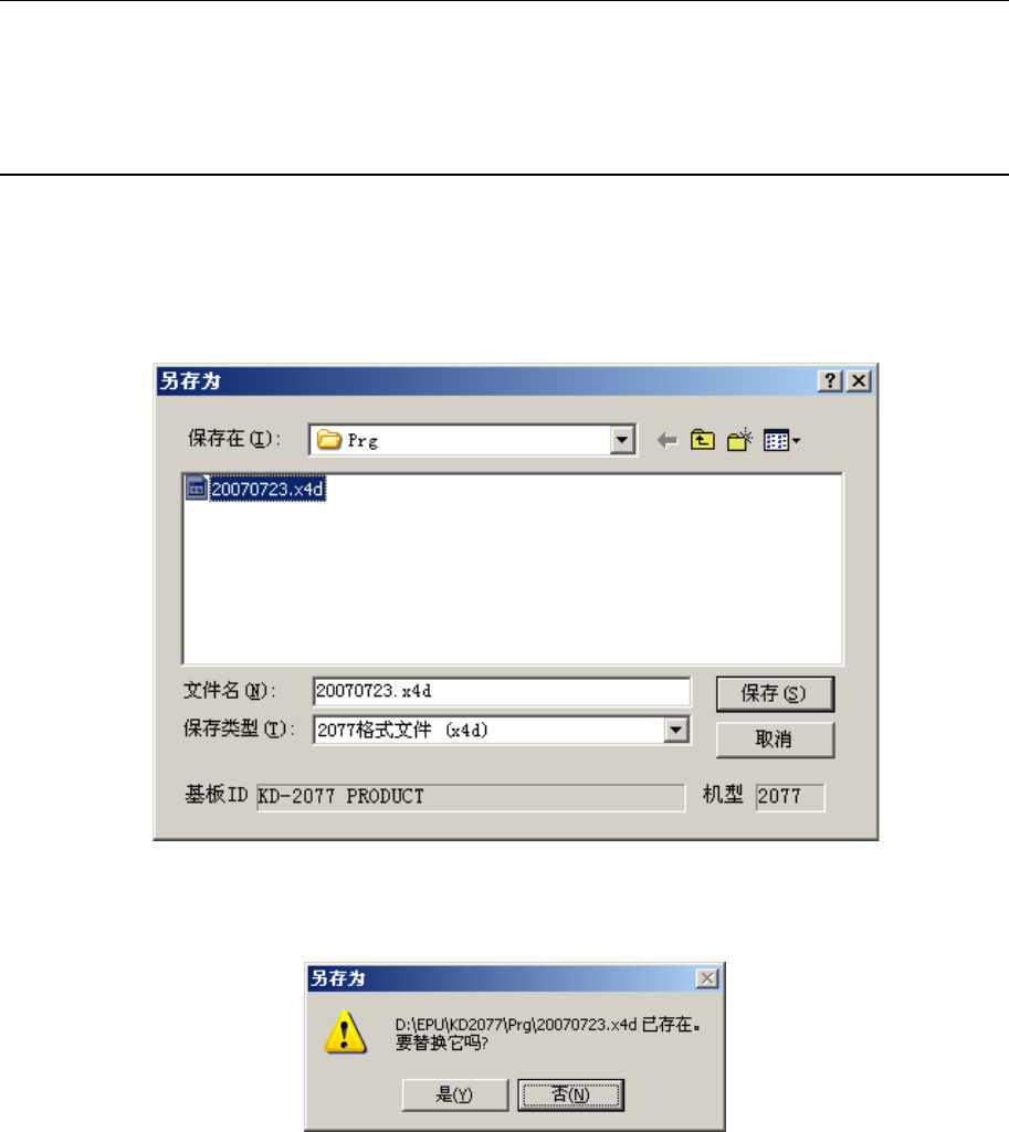第 4 章 制作生产程序 4- 49 4.3.4 保存 保存已制作的生 产程序。 选择「文件」 / 「保存」 则可执行该命 令。 4.3.5 另存为 将编辑后的生产 程序保存 于其它文件夹, 或更改文件名保 存时 , 选择此项。 < 步骤 > ① 选择「文件」 / 「另存为」 。 ② 在“另存为”画 面上指定 文件夹和文件名 , 单击「保存 」 。 图 4-3-5 文件另存为 若指定已有的生 产程序名 , 则会显示替 换保存…
