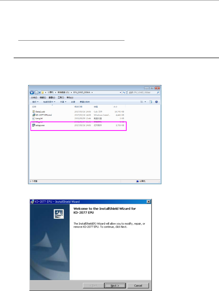 第 2 章 安装 2 -6 2.1 软 件的安装 使用安装向导,根据画面上显示的提示安装 EPU 。 中止安装时,请按下 < 取消 > 按钮。 以下将 对 EPU 的安装步骤进 行 说 明。 2.1.1 启动 安装向 导 (1) 将系统盘插入 CD-ROM 驱动器。 (2) 请启动安装 CD 内的 EPU_ ( Ver________ )文件夹内的「 Setup.exe 」。 (4) 确认画面上的提示,按下 <Ne…