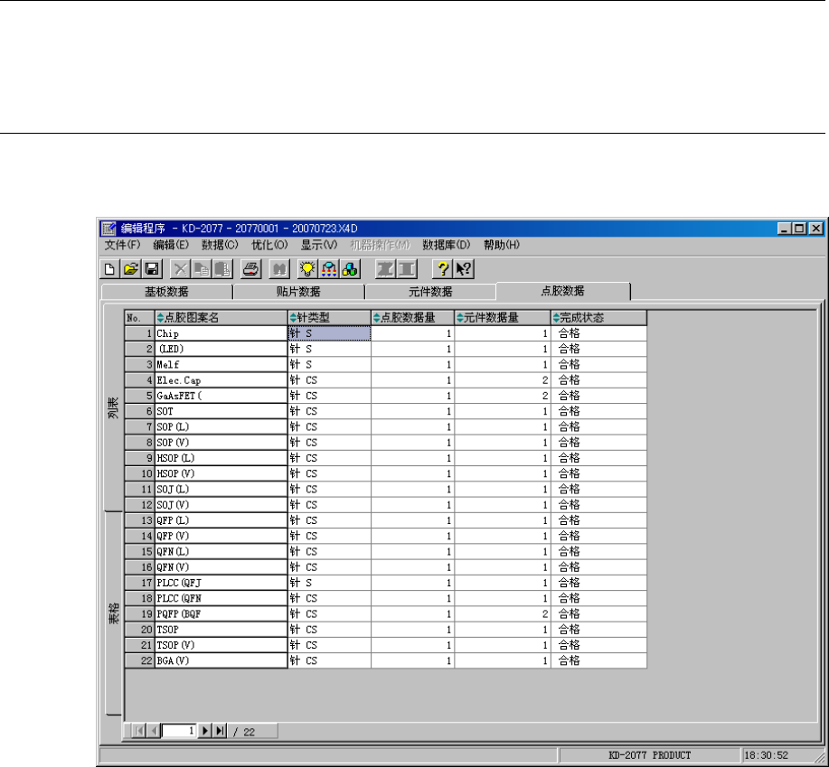 第 4 章 制作生产程序 4- 36 双击 点胶图案 名、或单击画面左侧的 「表格 」标签,打开以下 的表格画面。 点胶 图案 名中显示各个元 件数据中的 输入值 。 “点胶图案名” 、“ 针类型”、“ 固定 点胶顺 序”、“偏移 量数据”这 4 个项目可以在 表格 画面进行编集。 图 4 -1- 20 点胶数据 表格画面