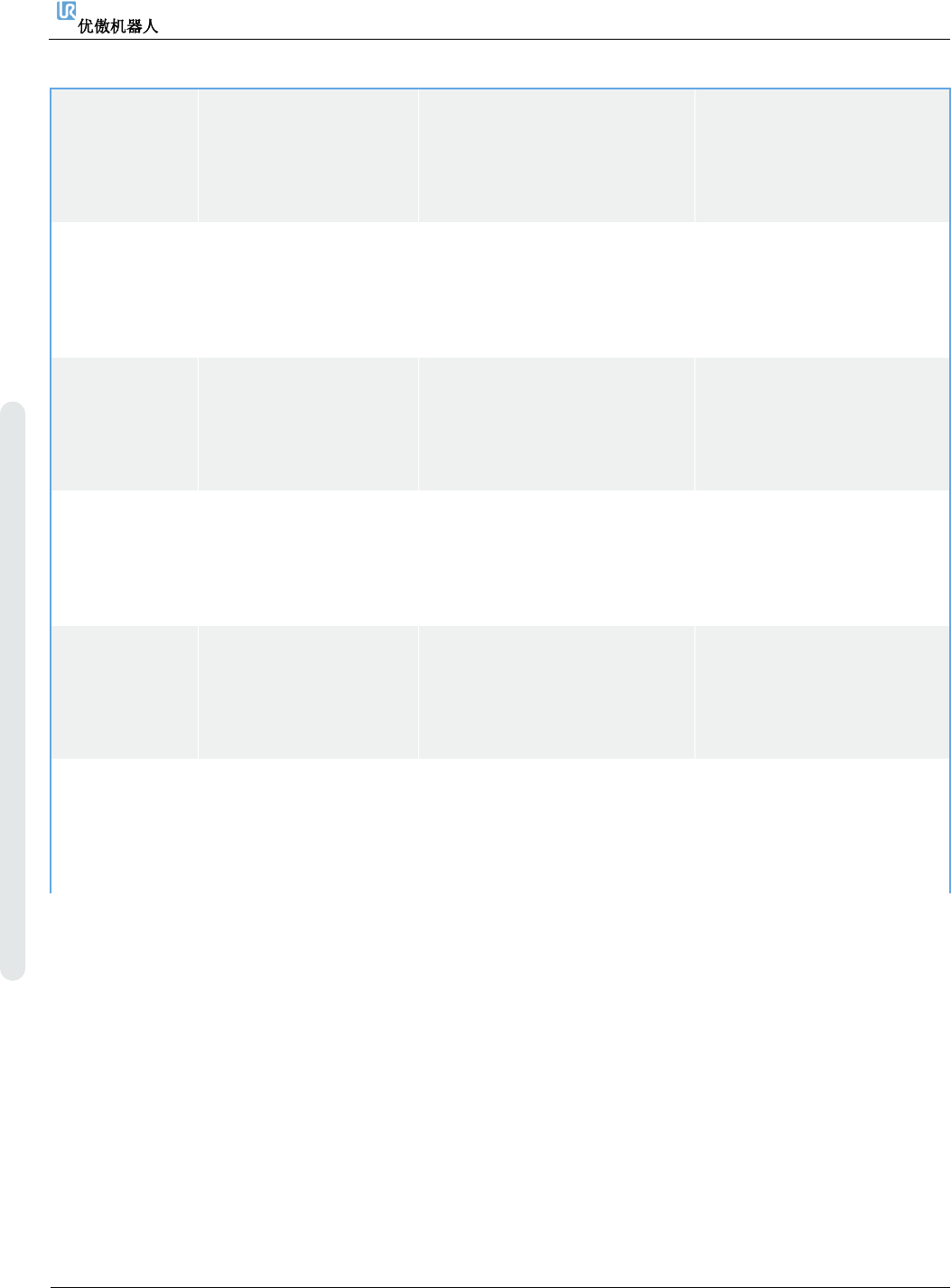 6. 故障排除 维修手册 1 19 维修手册 版权 © 2009 – 20 2 0 优傲机器人公司版 权所有。保留 所有权利。 C208A 调试认定失败 已执行认 定。 注 意: 该功能仅用 于测试目的。 C209A 触发了保护性停 止 (仅用 于测试目的) 触发了保护性停 止。 注意: 该功 能仅用于测试目 的。 C210A 如果机器人处于 本地 (示 教器) 控 制, Socket 为只 读 在 PolyScope 中 设 置 远 …