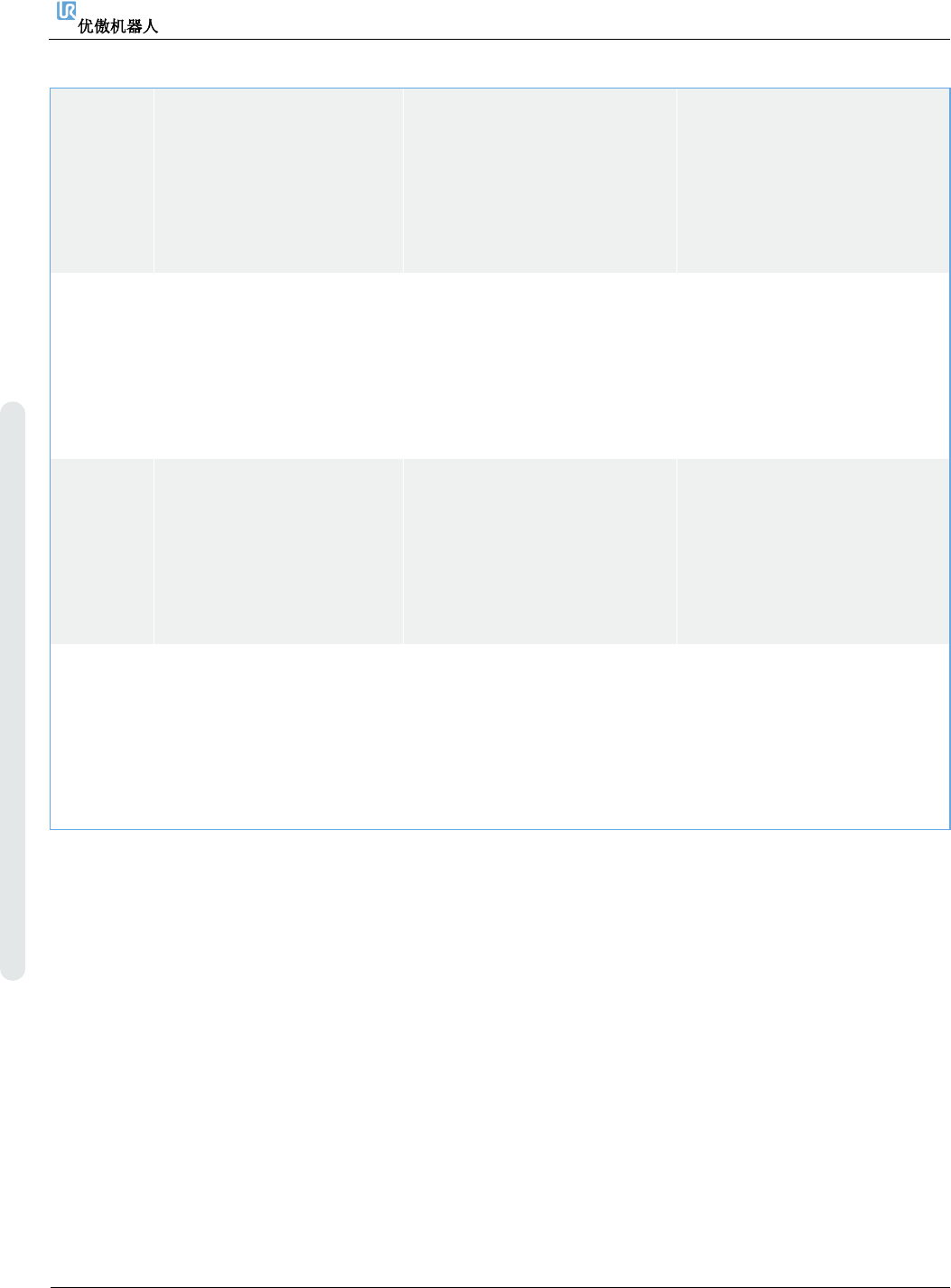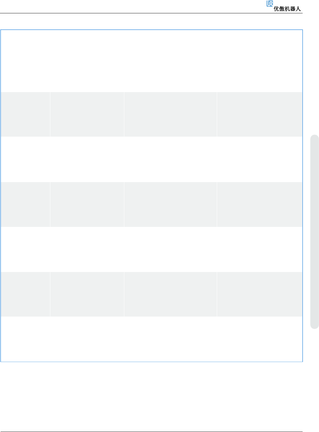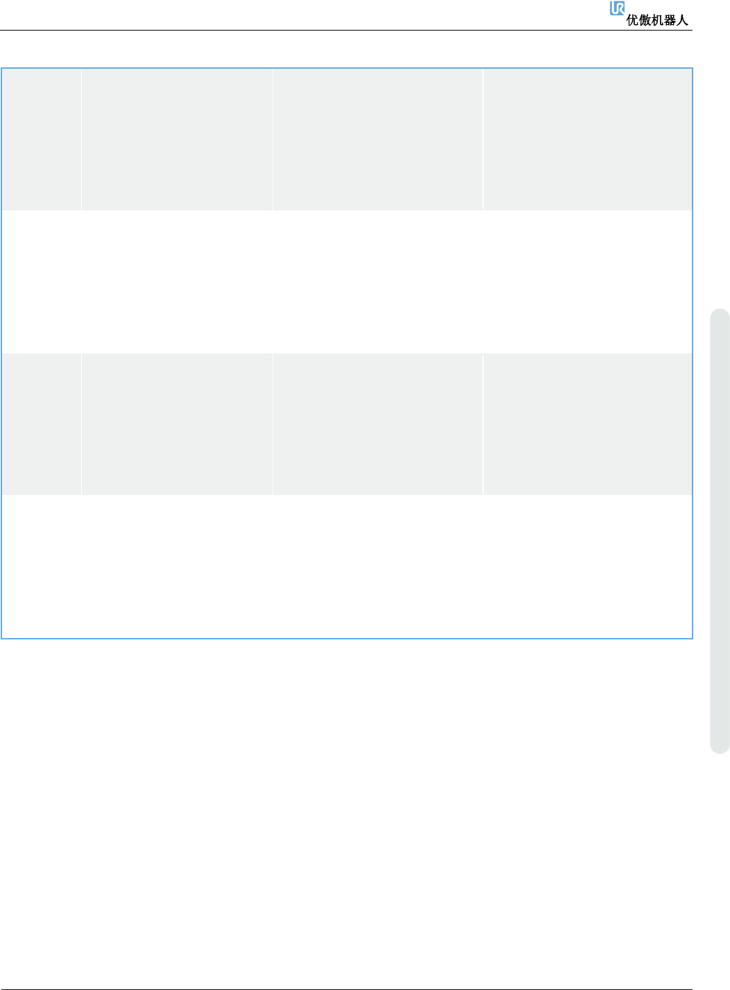 6. 故障排除 维修手册 138 维修手册 版权 © 2009 – 20 2 0 优傲机器人公司版 权所有。保留 所有权利。 C283A41 TCP 速 度 违 反 了 最 大 停 止 时间限值 a) 确 保 安 装 的 有 效 负 载 、 工 具中心点 TCP 和 CoG 与 您的配置相符。 b) 减速移动 c) 检查安全设置 d) 请 联 系 您 当 地 的 优 傲 机 器 人服务提供商寻求 帮助。 C283A42 TCP 速 度 …