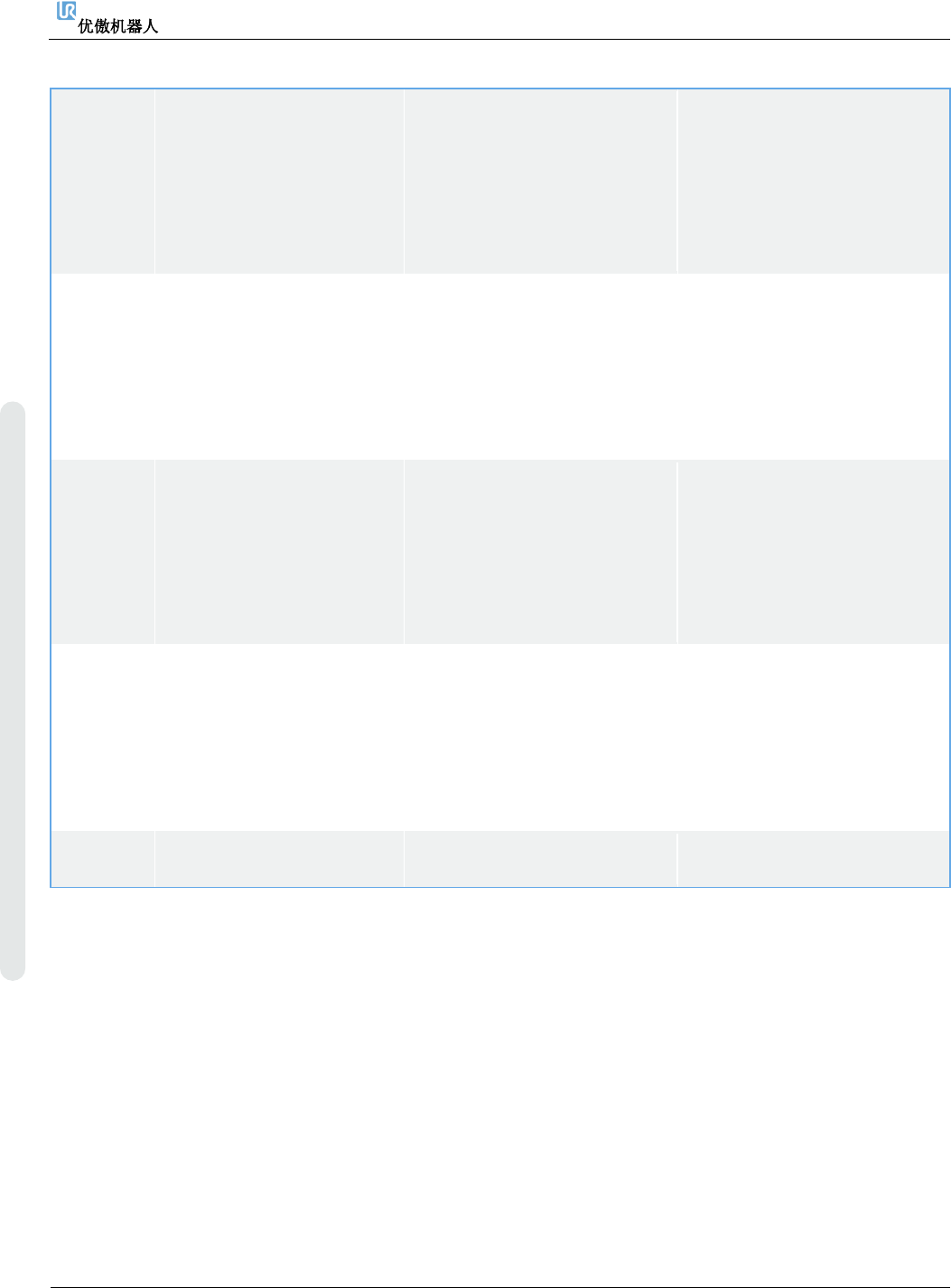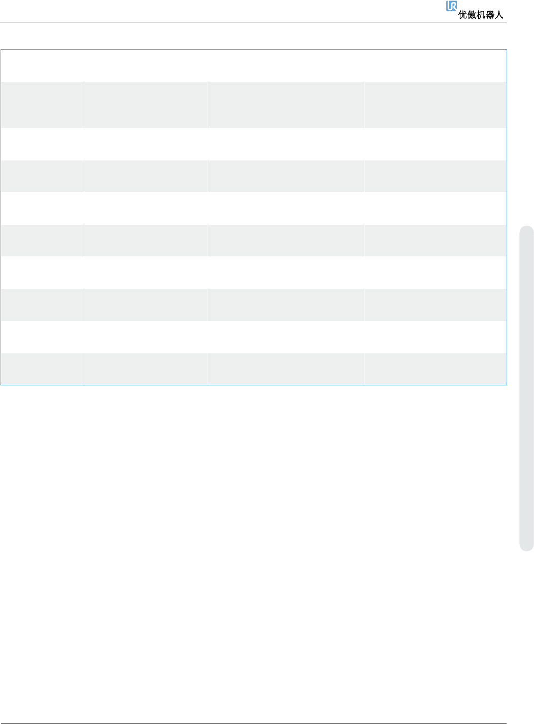 6. 故障排除 维修手册 140 维修手册 版权 © 2009 – 20 2 0 优傲机器人公司版 权所有。保留 所有权利。 C283A49 超过工具方向限 值 a) 确 保 安 装 的 有 效 负 载 、 工 具中心点和 C oG 与 您的配 置相符。 b) 减速移动 c) 检查安全设置 d) 请 联 系 您 当 地 的 优 傲 机 器 人服务提供商寻 求帮 助。 C283A50 超过肘部位置限 值 a) 确 保 安 装 的 有 效 …