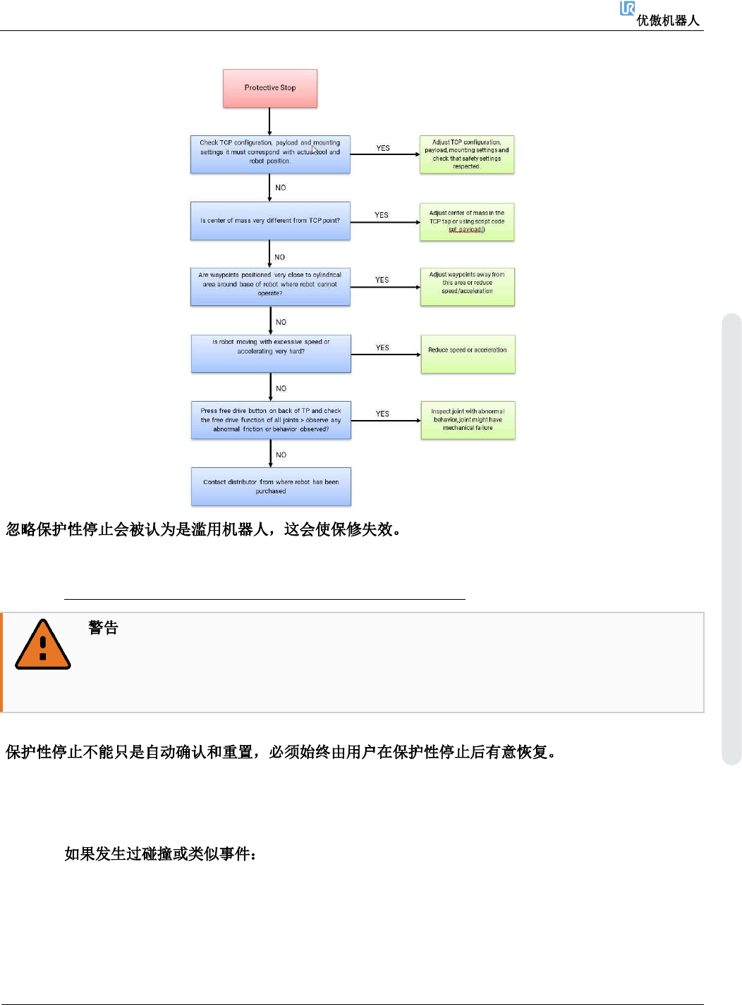 6. 故障排除 维修手册 163 维修手册 版权 © 2009 – 20 2 0 优傲机器人公司版 权所有。保留 所有权利。 在以下两种情况 下,这些故障可能会隐藏起来: 1. 工作人员只是简单地重 置故障,而不考虑引起故 障的原因。 忽略保护 性停止会掩盖 故障检测! 要小心注 意保护性停止。 了解它们 为什么会改进 您的程序并保留故 障检测! 一般来说,保 护性停止 是为了通知用户机 器人因外 部事件(如撞到障碍 物或类似事件 )而…