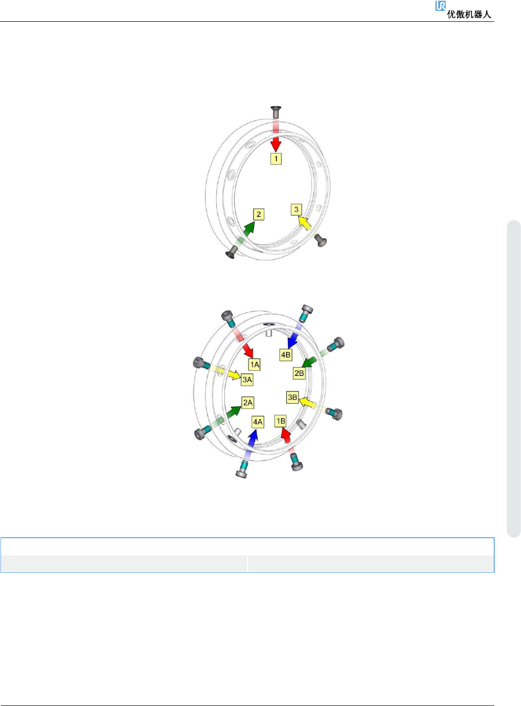4. 维修和更换零件 维修手册 30 维修手册 版权 © 2009 – 20 2 0 优傲机器人公司版 权所有。保留 所有权利。 1. 拆下蓝 色盖子上的 螺钉, 然后按照章节 分离关节 与配对关节的通用指南 所述 ,拆下蓝色盖子 。 2. 按照章 节 “ 关节上的电 源和通信连接器类型 ” 和 “ 关节上的连 接器位置 ” 中所 述, 地从端子上拆 下电源和通信电线 。 3. 取下黑 色扁型环。 可以使用小平头 螺丝 刀。 4. 拆下…