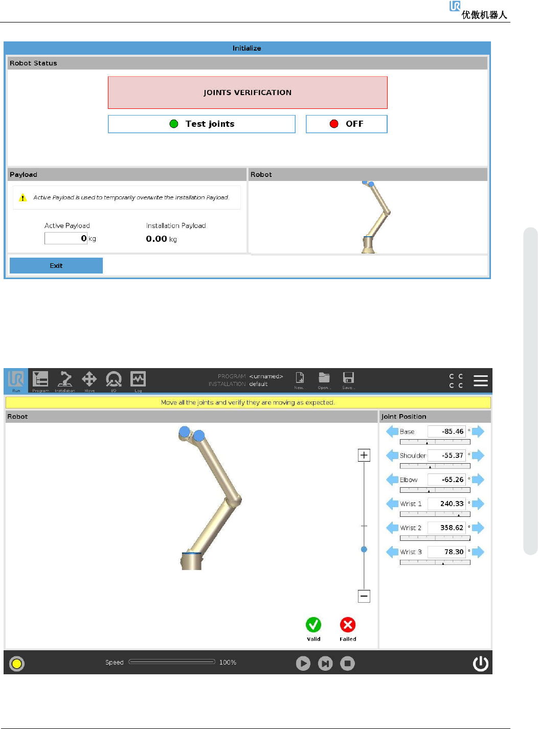 1. 如果关节按预期移动,按下“Valid(有效)”,弹出窗口就会出现。按照弹出的说明操作。