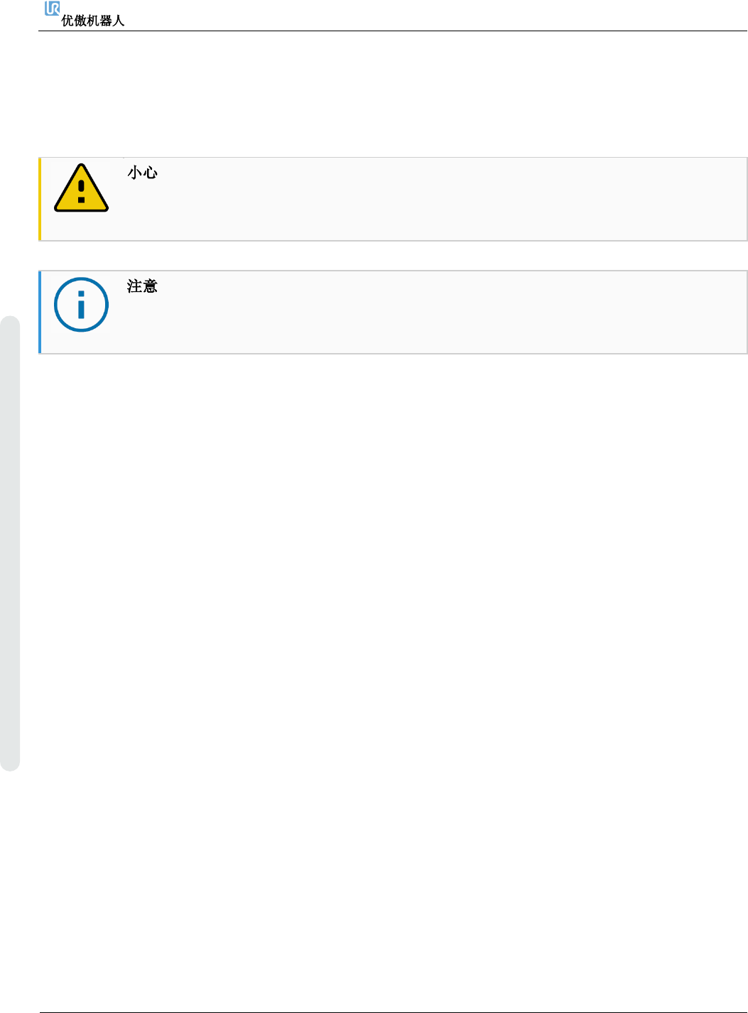 从机械臂到控制箱的最大机器人连接长度为12m。不正确的机器人连接会导致机械臂断电。