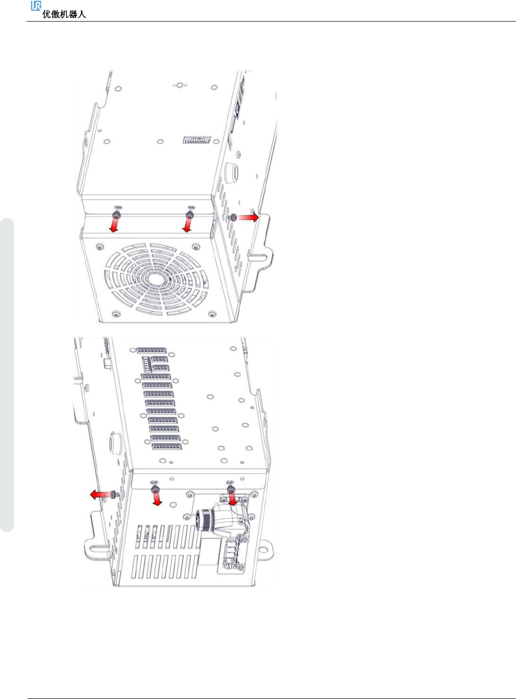 4. 维修和更换零件 维修手册 49 维修手册 版权 © 2009 – 20 2 0 优傲机器人公司版 权所有。保留 所有权利。 7. 现在需要将里面的 电源插 头从框架上断开,正确操作方式如 第 8 步所示。 8. 拆卸电源插头时, 需要使 用一把 2m m 的小平头 螺丝刀。拔出电源插头, 同时将两个前卡扣 向 上倾斜。 9. 拆除控制板的所有 连接。 10. 将控制箱平放