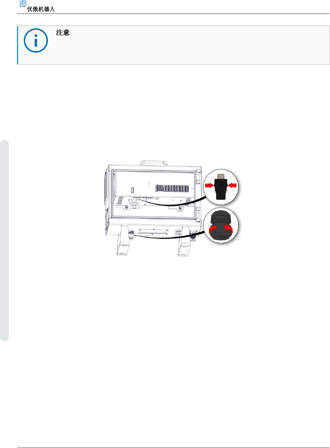 4. 维修和更换零件 维修手册 56 维修手册 版权 © 2009 – 20 2 0 优傲机器人公司版 权所有。保留 所有权利。 更换示教 器会导致系统 在启动时报告故障 。 ⚫ 始终要为示教器 类型选择正确的配置。 要拆卸: 1. 关闭控 制箱电源, 并将电 源线从电源上断开。 2. 拆除并 丢弃用于安 装示教 器电缆的两根电缆扎带 。 3. 如下图 所示,按下 示教器 插头两侧的卡扣,然后 向下拉,从示教器端口上断 开。 4. 完全…