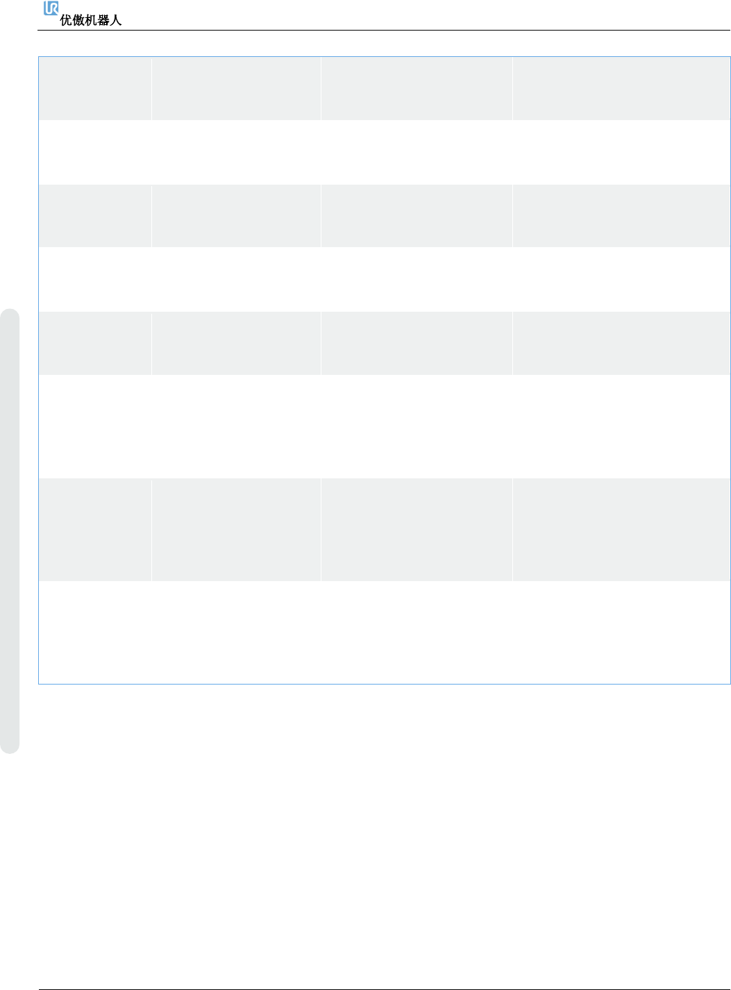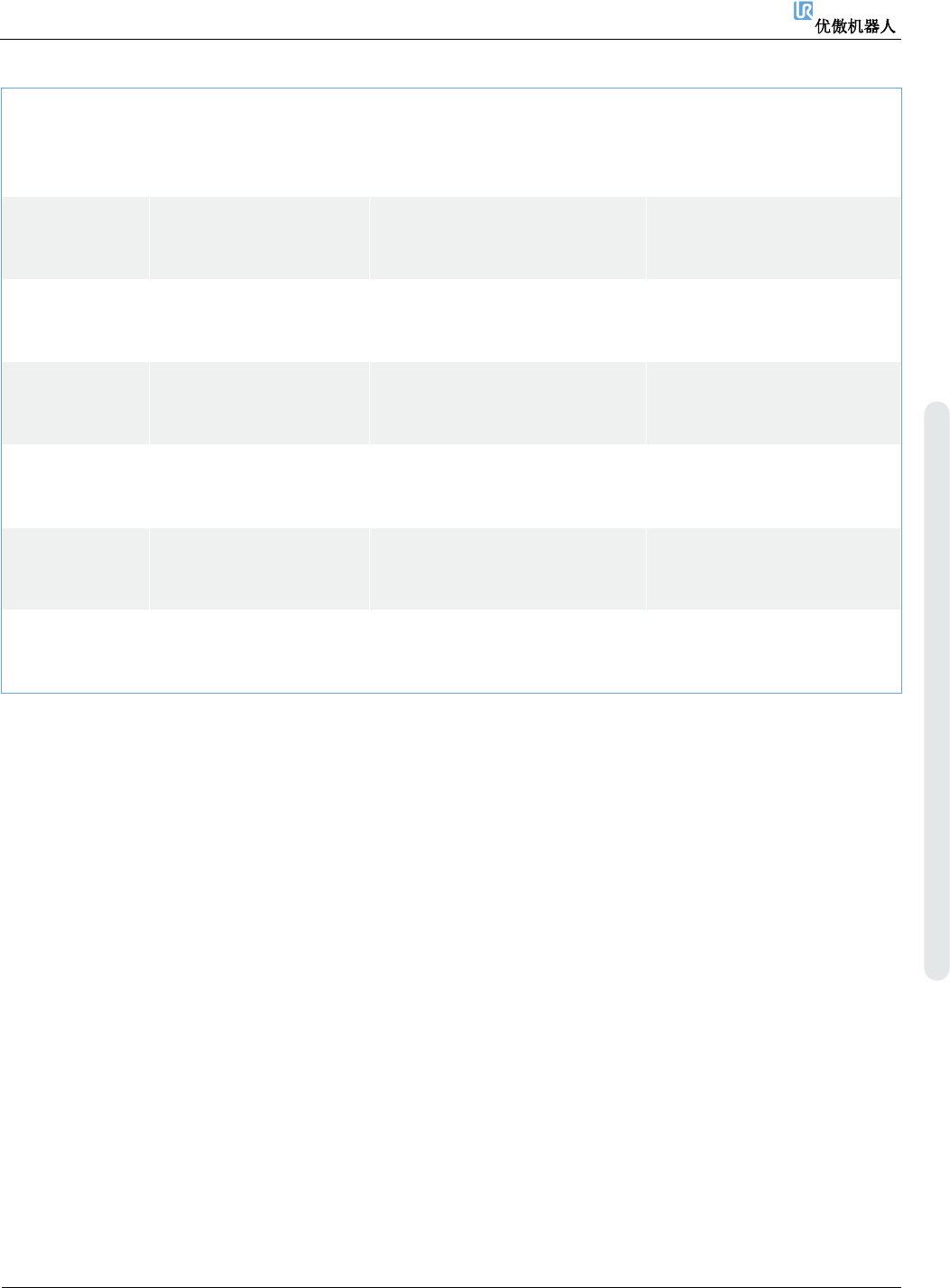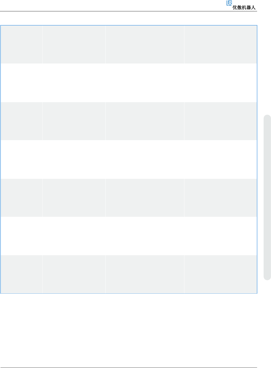 6. 故障排除 维修手册 72 维修手册 版权 © 2009 – 20 2 0 优傲机器人公司版 权所有。保留 所有权利。 C4A14 与关节 2 之间的通 信丢失 不止 1 个数 据包丢失 a) 验 证 通 信 电 缆 的 连 接 是 否 正确。 b) 执行 完整 的重启序列 C4A15 与关节 3 之间的通 信丢失 不止 1 个数 据包丢失 a) 验 证 通 信 电 缆 的 连 接 是 否 正确。 b) 执行 完整 的重启序列 C4…