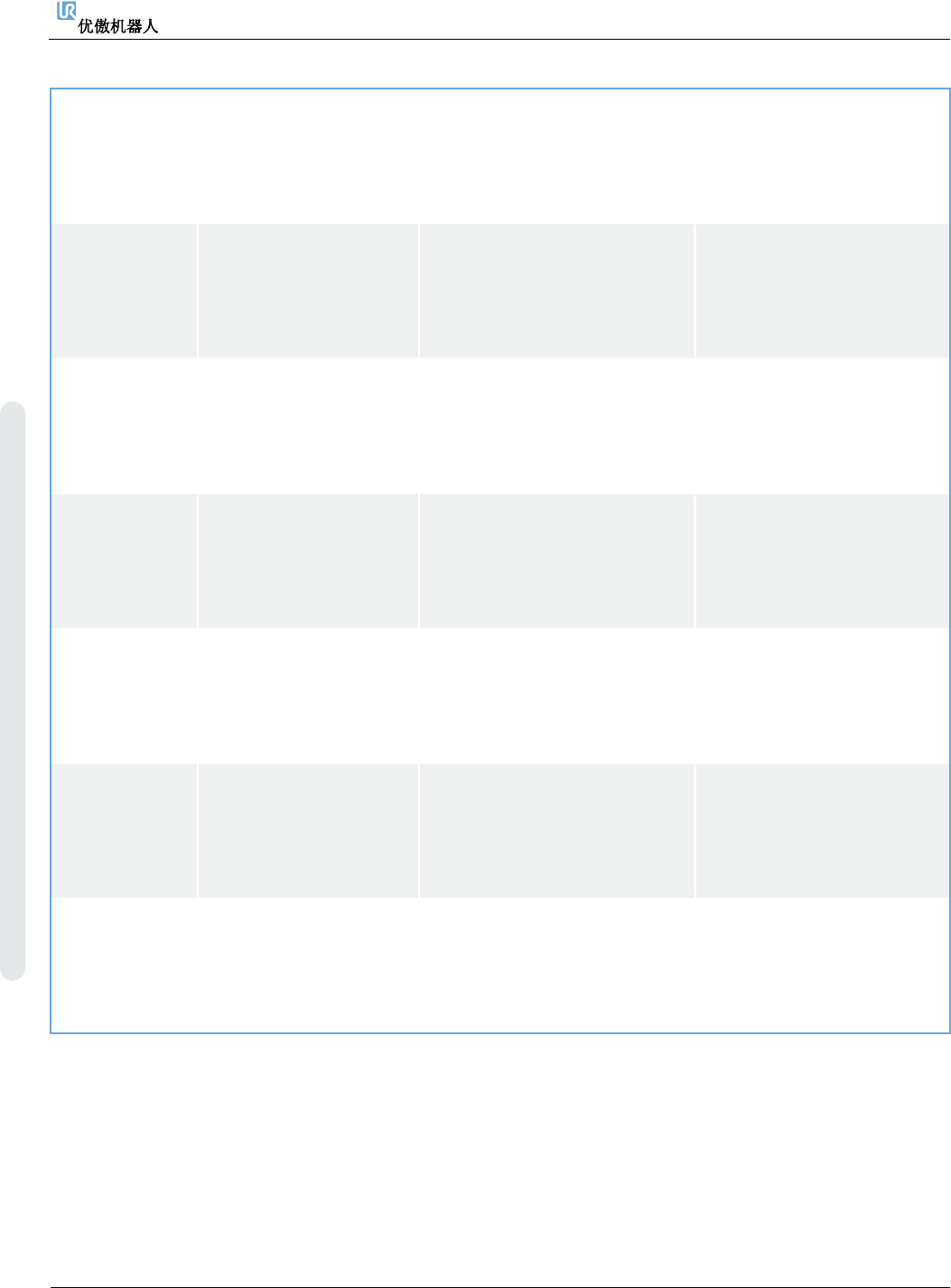 6. 故障排除 维修手册 75 维修手册 版权 © 2009 – 20 2 0 优傲机器人公司版 权所有。保留 所有权利。 C4A82 数 据 包 计 数 器 中 的 数 量 与 副 界 面 中 的 数 据 包 数 量不一致 示教器中的安全 处理器 2 存在 数据包不一致的 情况 如 果 日 志 中 经 常 出 现 这 种 情 况,则需: a) 验 证 通 信 电 缆 的 连 接 是 否正确。 b) 执行完整的重启序列 C4A83 数 …