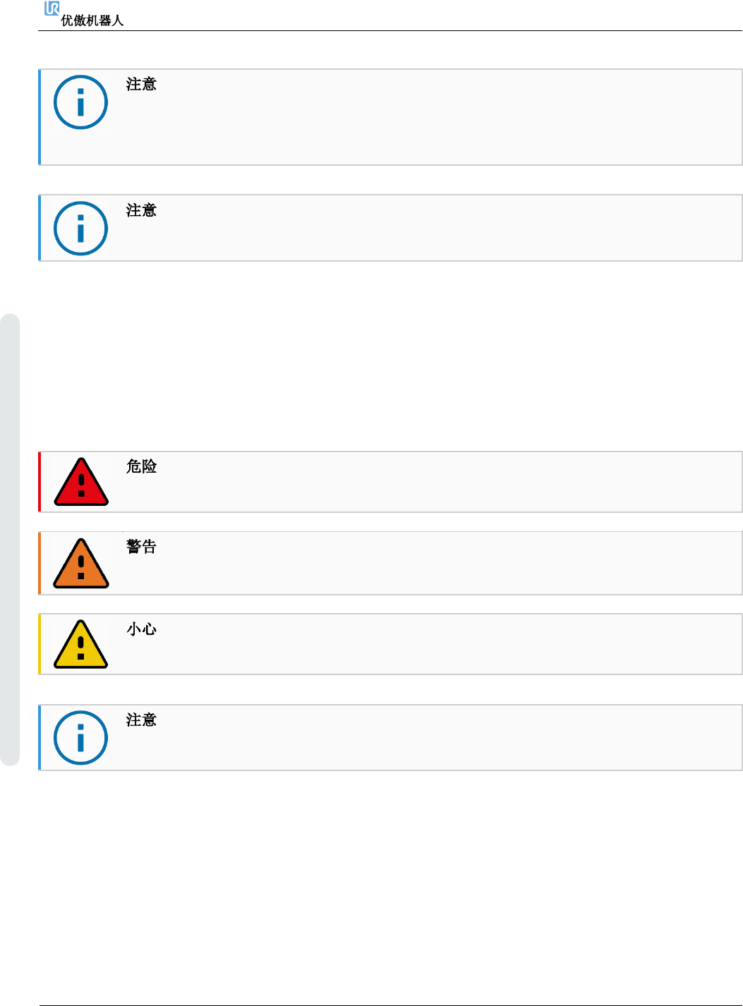 本手册中使用了“危险”、“警告”、“小心”、“注意”和“安全说明”等表述,用于强调重要且关键的信息。