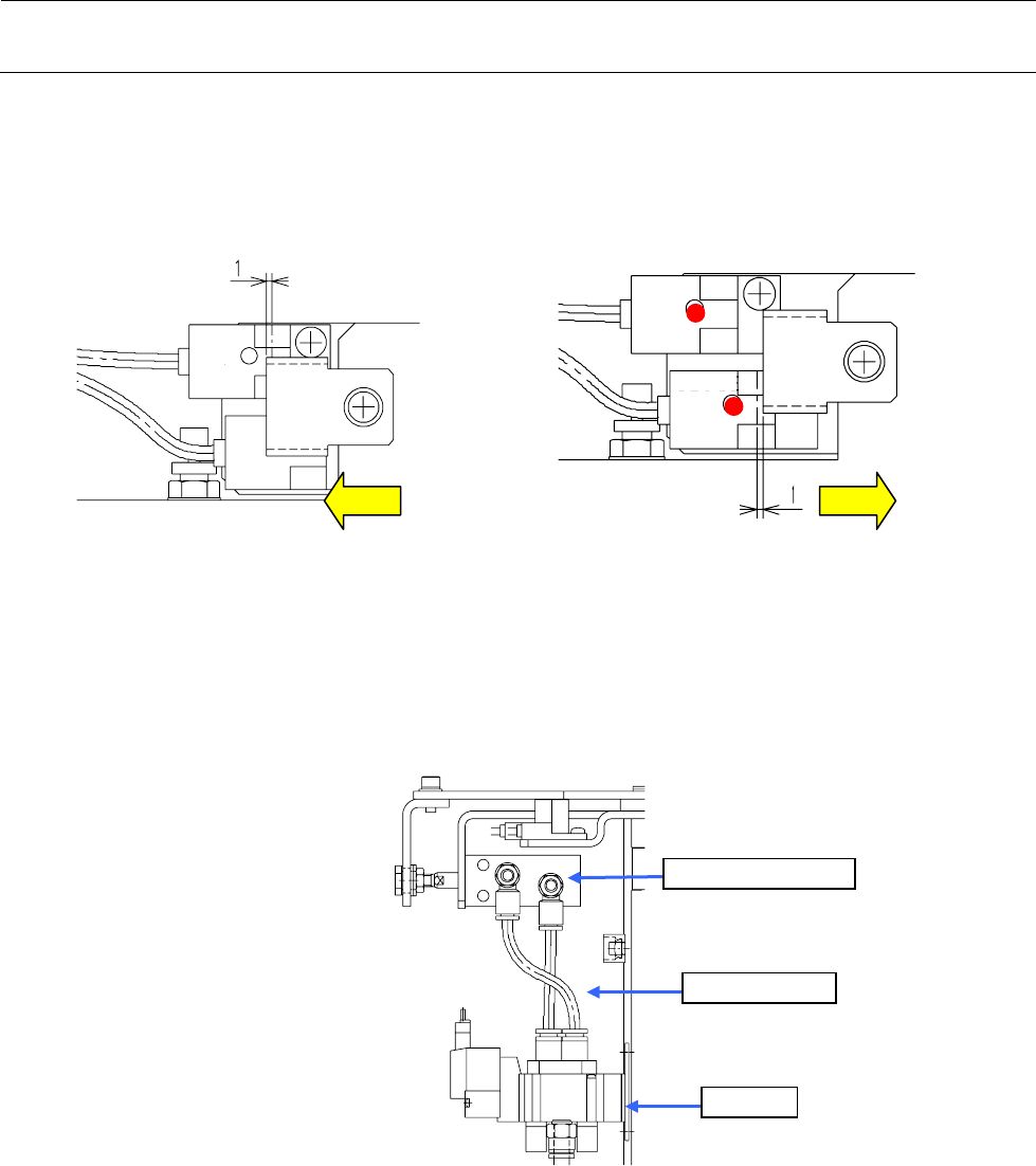 维修调整要领书 7-3 5 ) 请调整传感器配件的位置。 OPEN 时 → 逐渐打开滑板,在 LED 熄灭之后进入 1mm 的地方固定传感器碰块。 CLOSE 时 → 逐渐关闭滑板,在 LED 点亮之后离开 1mm 的地方滑板应停止。 图 7 -1- 3 OPEN 时 图 7 -1- 4 CLOSE 时 6 ) 请装配 φ4 空气软管。 请参照下图,用空气软管 (φ 4 ) 装配调速器和电磁阀。 图 7 -1- 5 空气配管和速度控制器…