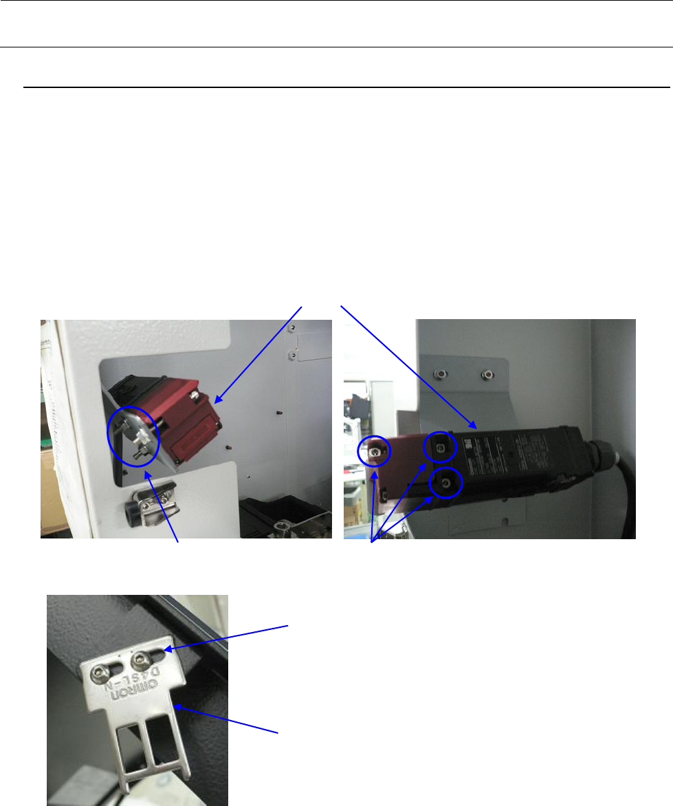 维修调整要领书 11 -3 11 -3 . 护罩打开开关的更换 1 ) 请从 ① 护罩打开开关本体的线束中继部拔出连接 2 ) 请切断束线箍, 拆下 ② 固定 螺钉 ( SL6044002TN ) , ③ 带垫圈内六角螺栓 ( NF3040520SF ) , 更换 开关的主体。 3 ) 安装时请按照相反的程序进行。 ※ 1 背侧也请用相同的方法更换。 ※ 2 安装后,请确认安装在安全罩上的 ④ 安全开关钥匙是否被正确插入护罩开放开关。 …
