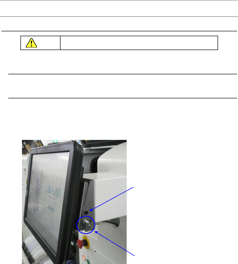 维修调整要领书 13 -1 13 其它机器 13 -1 . LCD 监视器 13 -1- 1 . LCD 监视器的更换方法 1) 请从 LCD 监视器拆下线束。 2) 拆下 ① 轴位螺丝及 ②③④ 蝶形螺丝等后,把 LCD 向上抬起卸下。 (反向侧的轴位螺丝不拆下) 3 ) 安装时,请按照相反的程序进行安装。 危险 为了防止突然的起动造成事故,请关掉电源之后再进行操作。 ②③④ ①