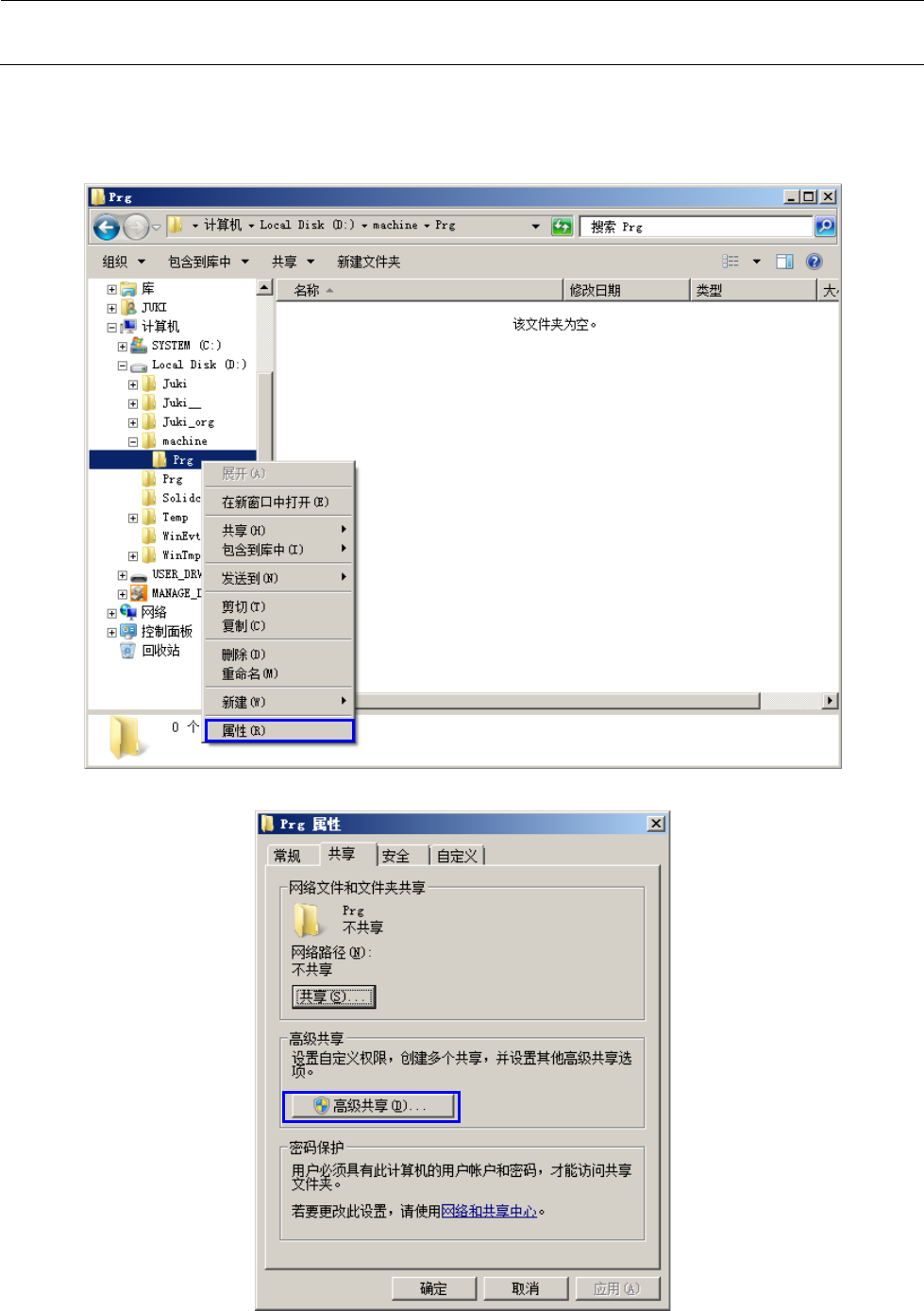 维修调整要领书 13 - 42 13 -2- 3-2 . 共有文件夹的设定 设定网络通讯的共有文件夹。 在 D 驱动器下,编制 “ D:\ machine \ Pr g ” 的文件夹,设定共有 Prg 文件夹 。 1 ) 起动浏览器。 2 ) 选择 ① [D 驱动器 ] ,选择「新建文件夹」。 3 ) 请输入文件夹名: machine 。