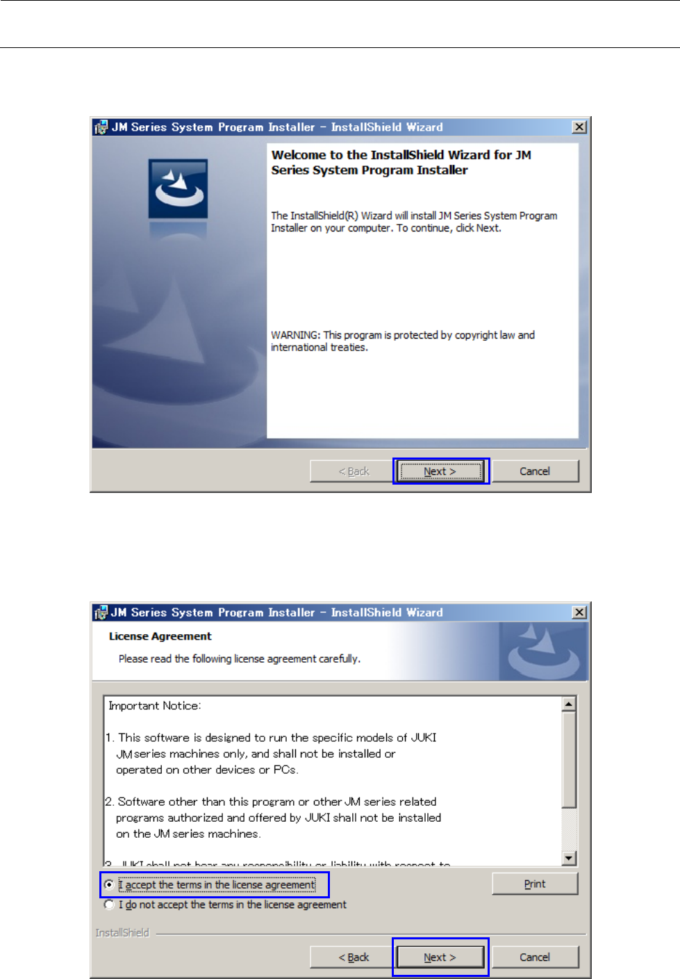 7) 显示关于使用许可协议的确认画面。